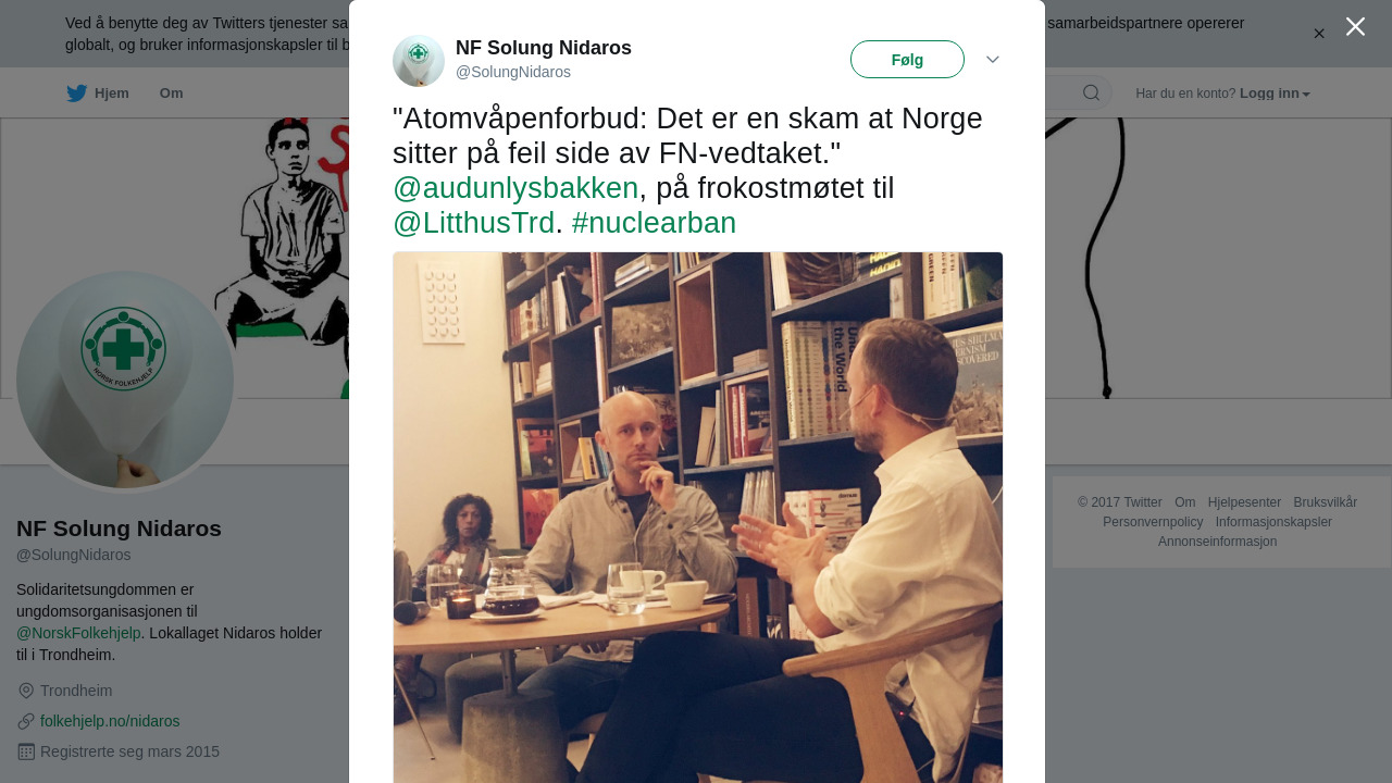 RT @SolungNidaros: "Atomvåpenforbud: Det er en skam at Norge sitter på feil side av FN-vedtaket." @audunlysbakken, på frokostmøtet til… https://t.co/2uZzoQG1Z5