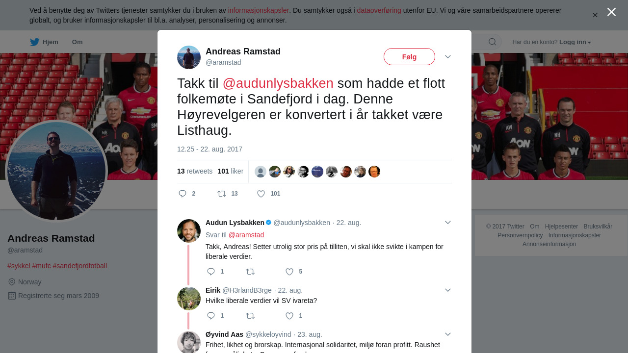 RT @aramstad: Takk til @audunlysbakken som hadde et flott folkemøte i Sandefjord i dag. Denne Høyrevelgeren er konvertert i år takket være Listhaug.