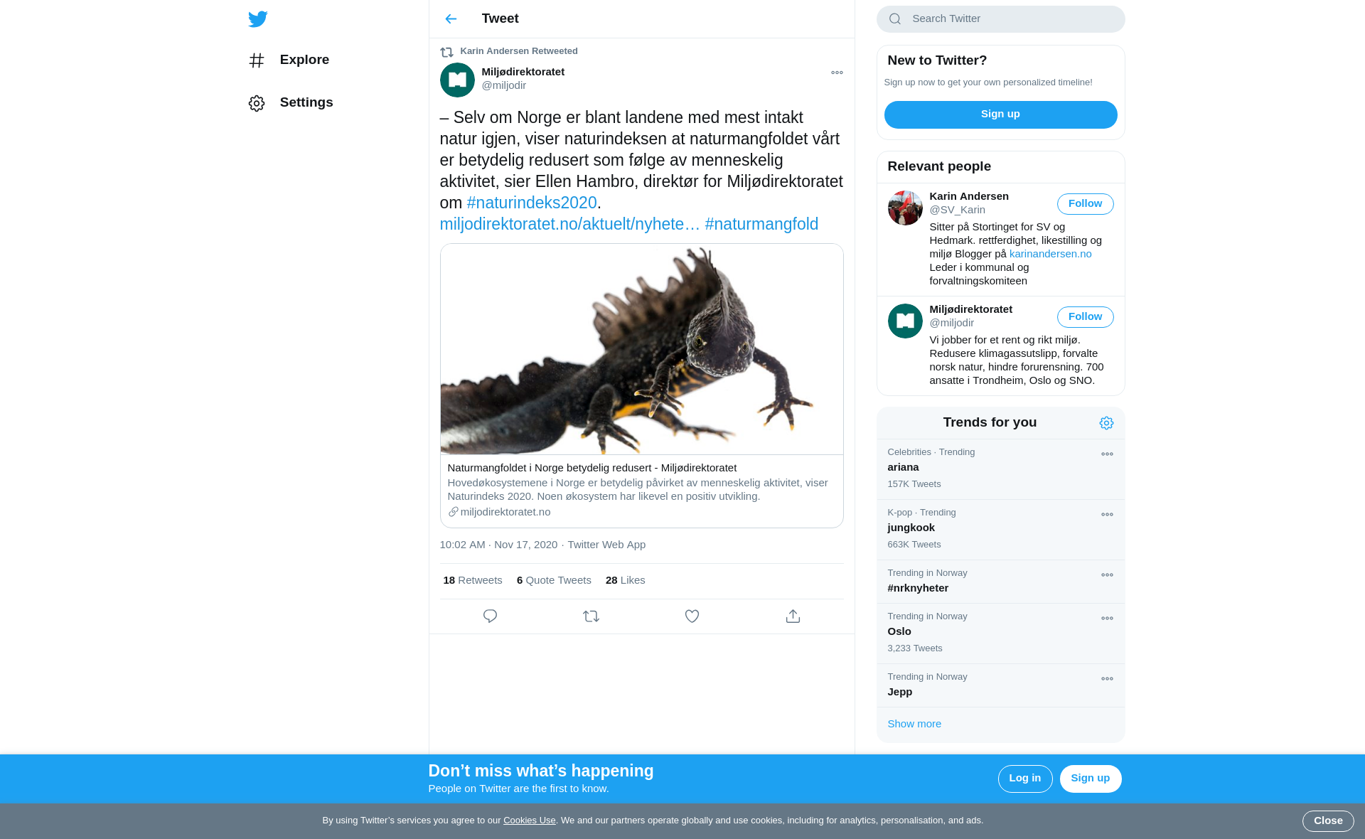 RT @miljodir: – Selv om Norge er blant landene med mest intakt natur igjen, viser naturindeksen at naturmangfoldet vårt er betydelig redusert som følge av menneskelig aktivitet, sier Ellen Hambro, direktør for Miljødirektoratet om #naturindeks2020. https://t.co/gQYU5JFsVY #naturmangfold