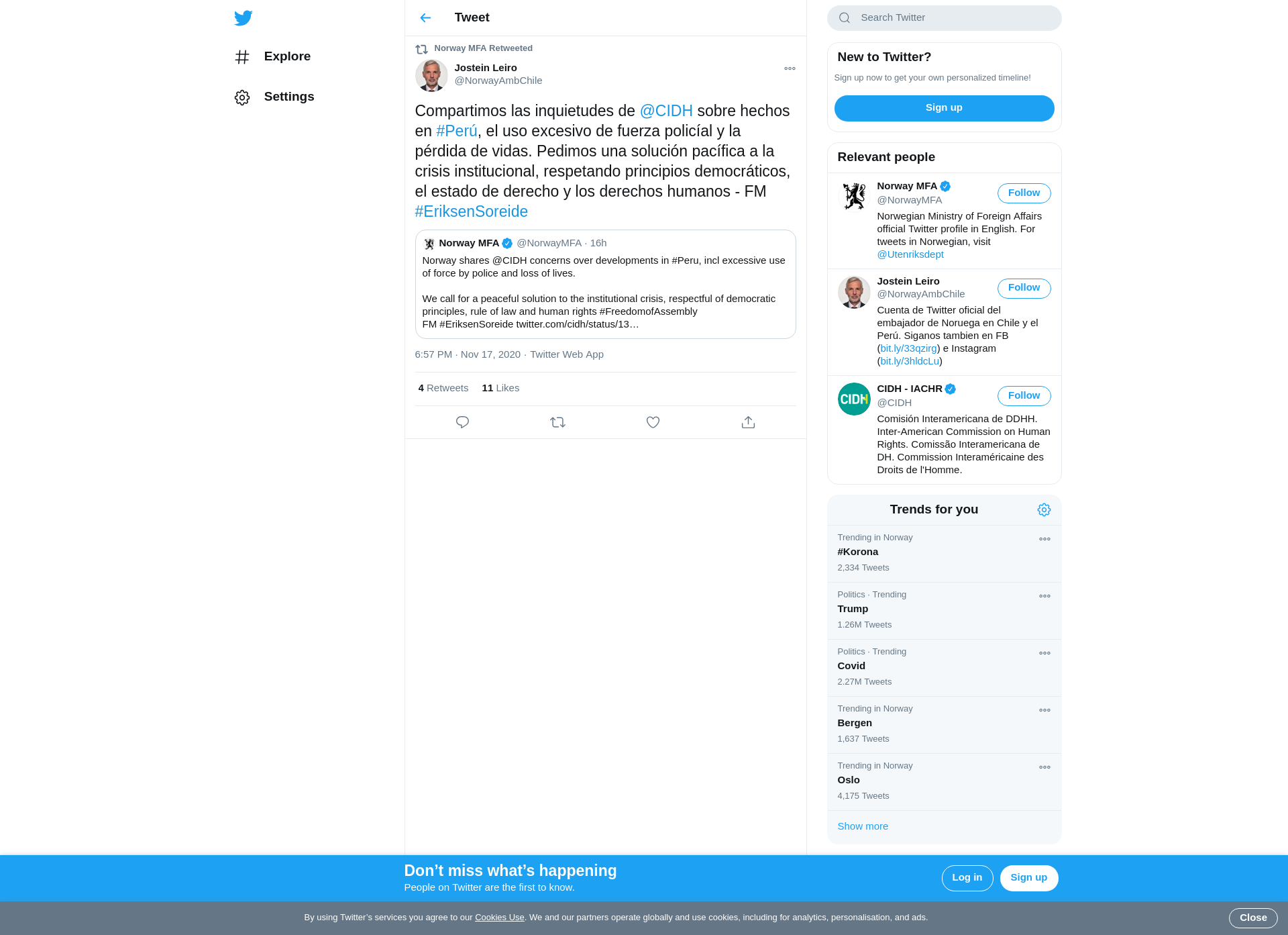 RT @NorwayAmbChile: Compartimos las inquietudes de @CIDH sobre hechos en #Perú, el uso excesivo de fuerza policíal y la pérdida de vidas. Pedimos una solución pacífica a la crisis institucional, respetando principios democráticos, el estado de derecho y los derechos humanos - FM #EriksenSoreide