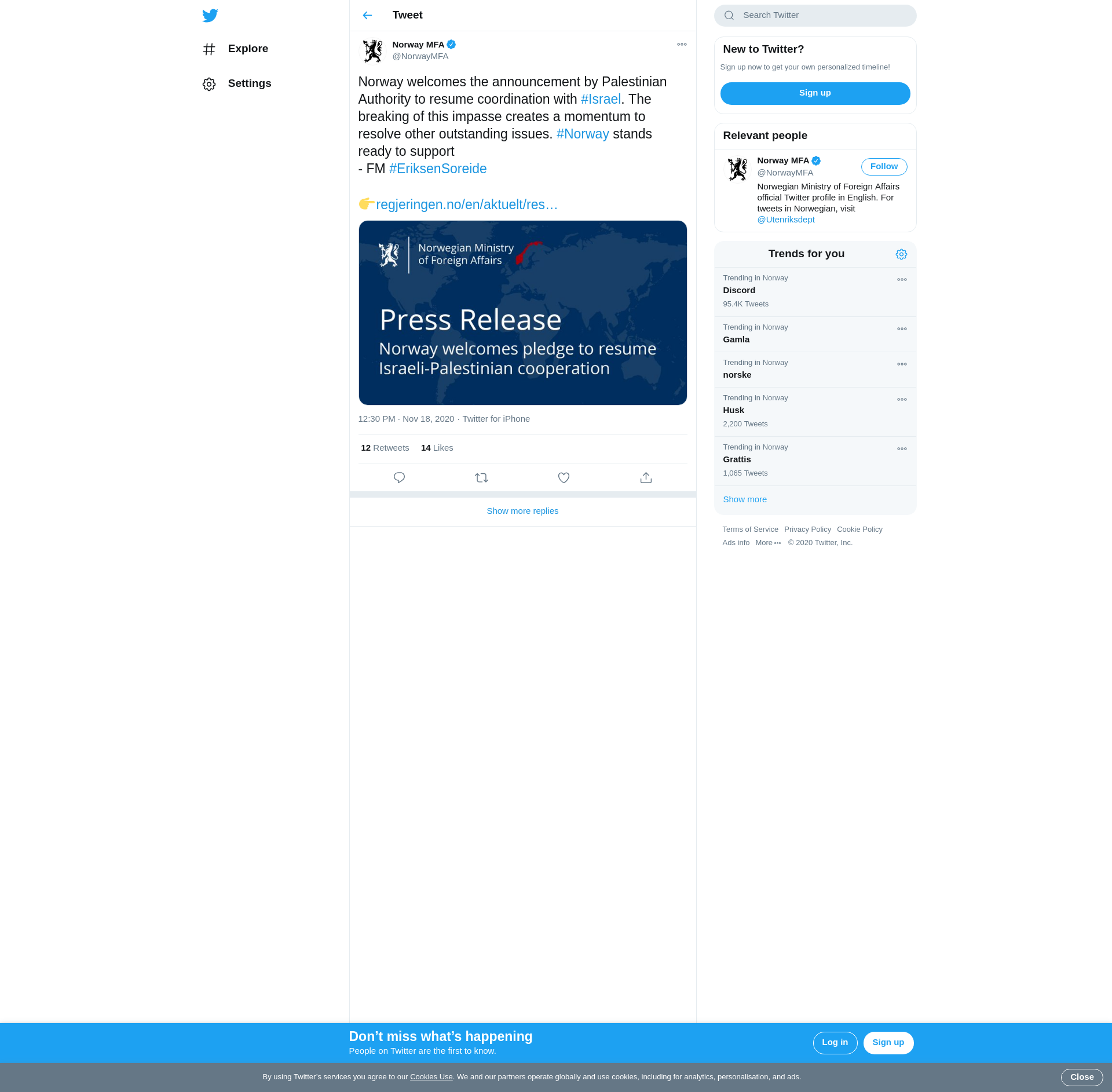Norway welcomes pledge to resume Israeli-Palestinian cooperation