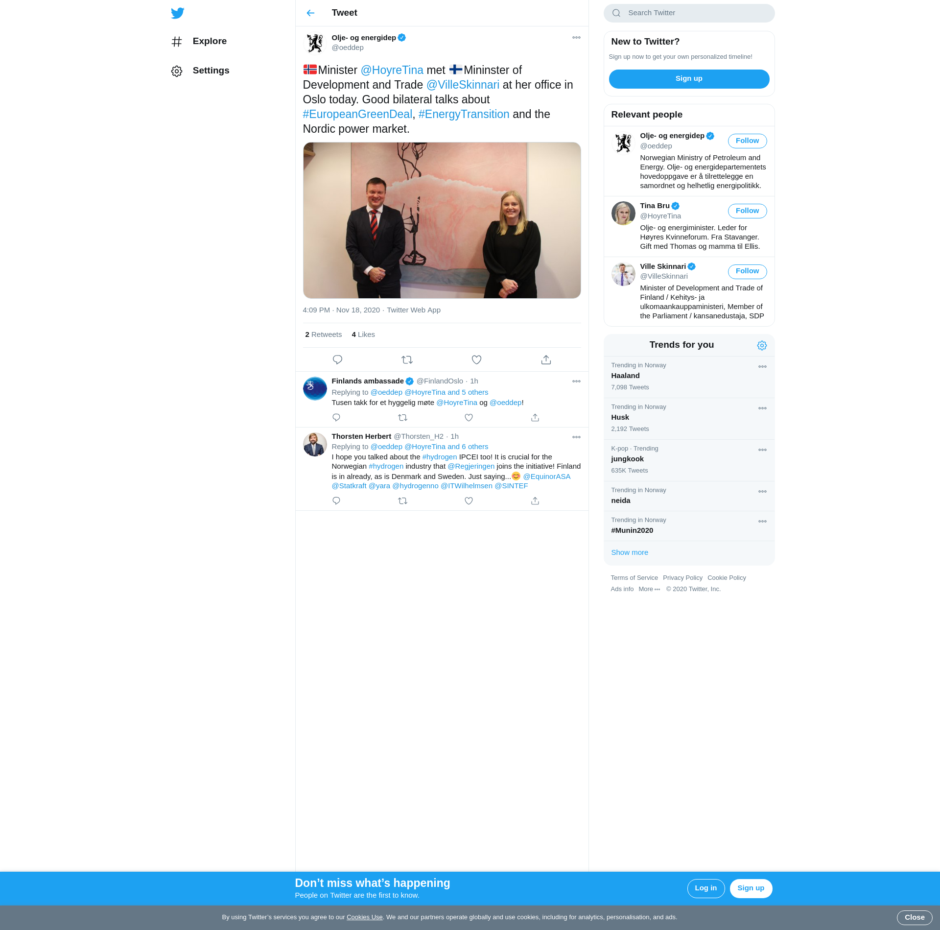 🇳🇴Minister @HoyreTina met 🇫🇮Mininster of Development and Trade @VilleSkinnari at her office in Oslo today. Good bilateral talks about #EuropeanGreenDeal, #EnergyTransition and the Nordic power market. https://t.co/XyMQyebvDa