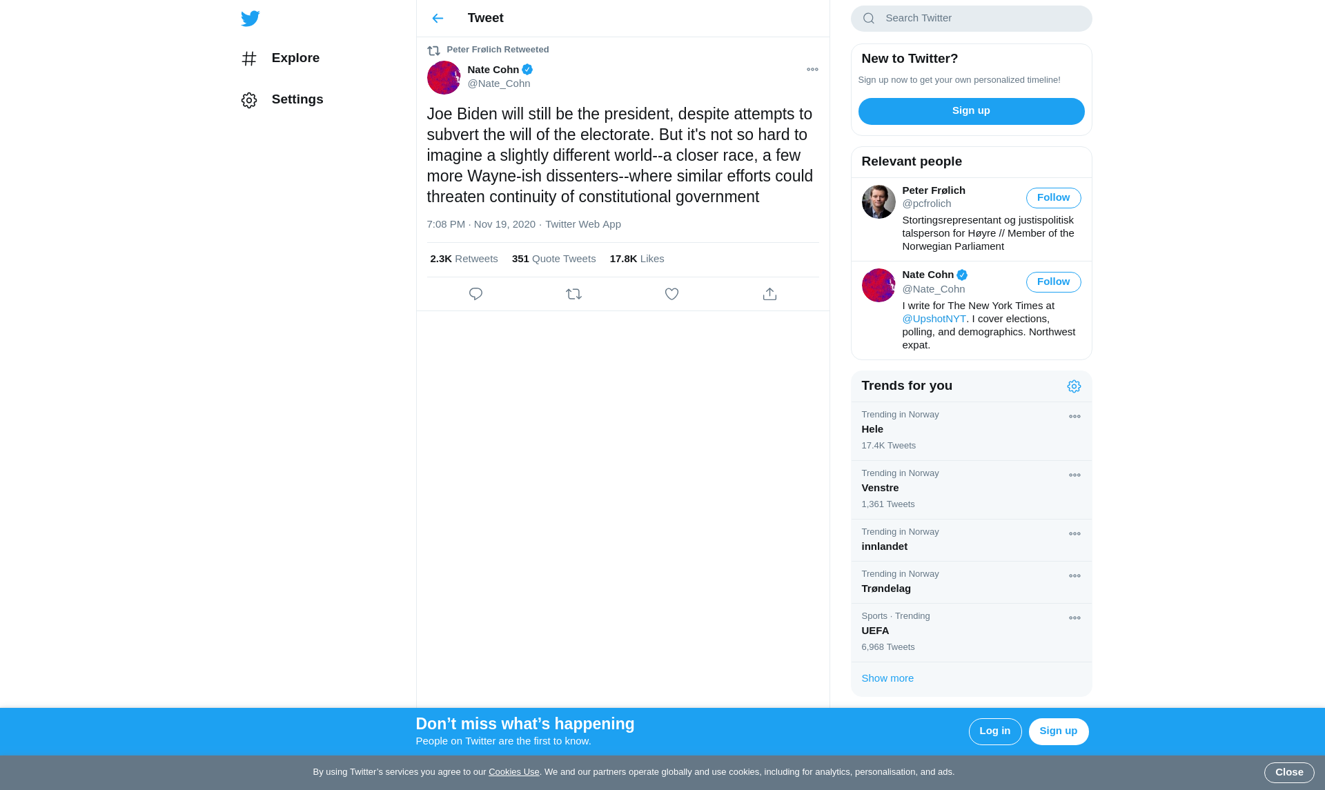 RT @Nate_Cohn: Joe Biden will still be the president, despite attempts to subvert the will of the electorate. But it's not so hard to imagine a slightly different world--a closer race, a few more Wayne-ish dissenters--where similar efforts could threaten continuity of constitutional government