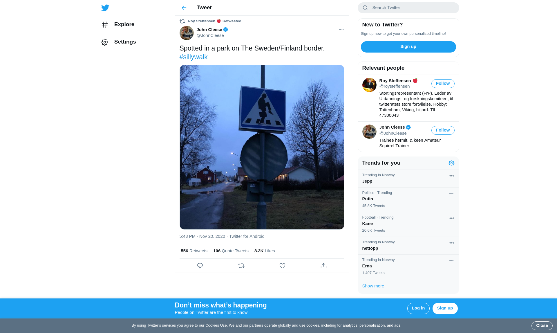 RT @JohnCleese: Spotted in a park on The Sweden/Finland border. #sillywalk https://t.co/ww3lww7OcO