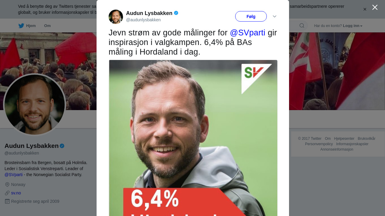 RT @audunlysbakken: Jevn strøm av gode målinger for @SVparti gir inspirasjon i valgkampen. 6,4% på BAs måling i Hordaland i dag. https://t.co/rH4LOfUkdZ