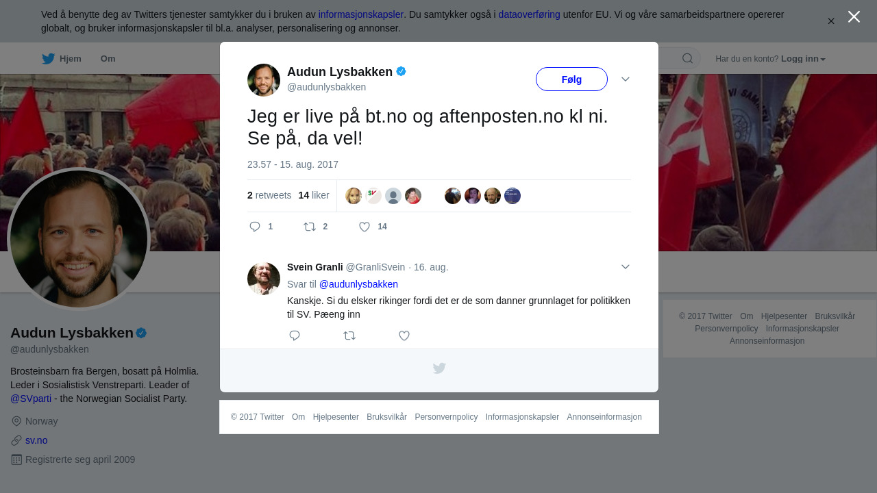 RT @audunlysbakken: Jeg er live på bt.no og aftenposten.no kl ni. Se på, da vel!