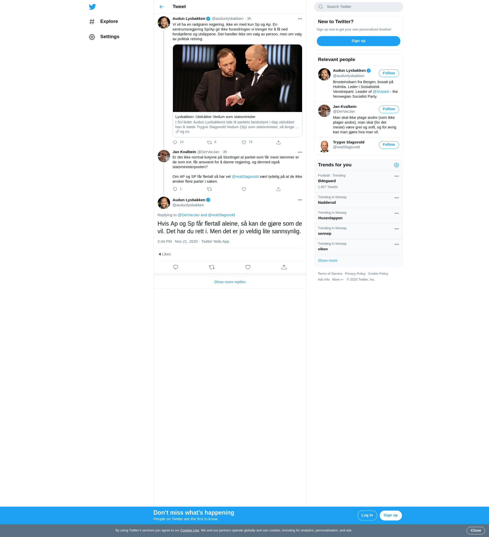 @DerVarJan @realSlagsvold Hvis Ap og Sp får flertall aleine, så kan de gjøre som de vil. Det har du rett i. Men det er jo veldig lite sannsynlig.