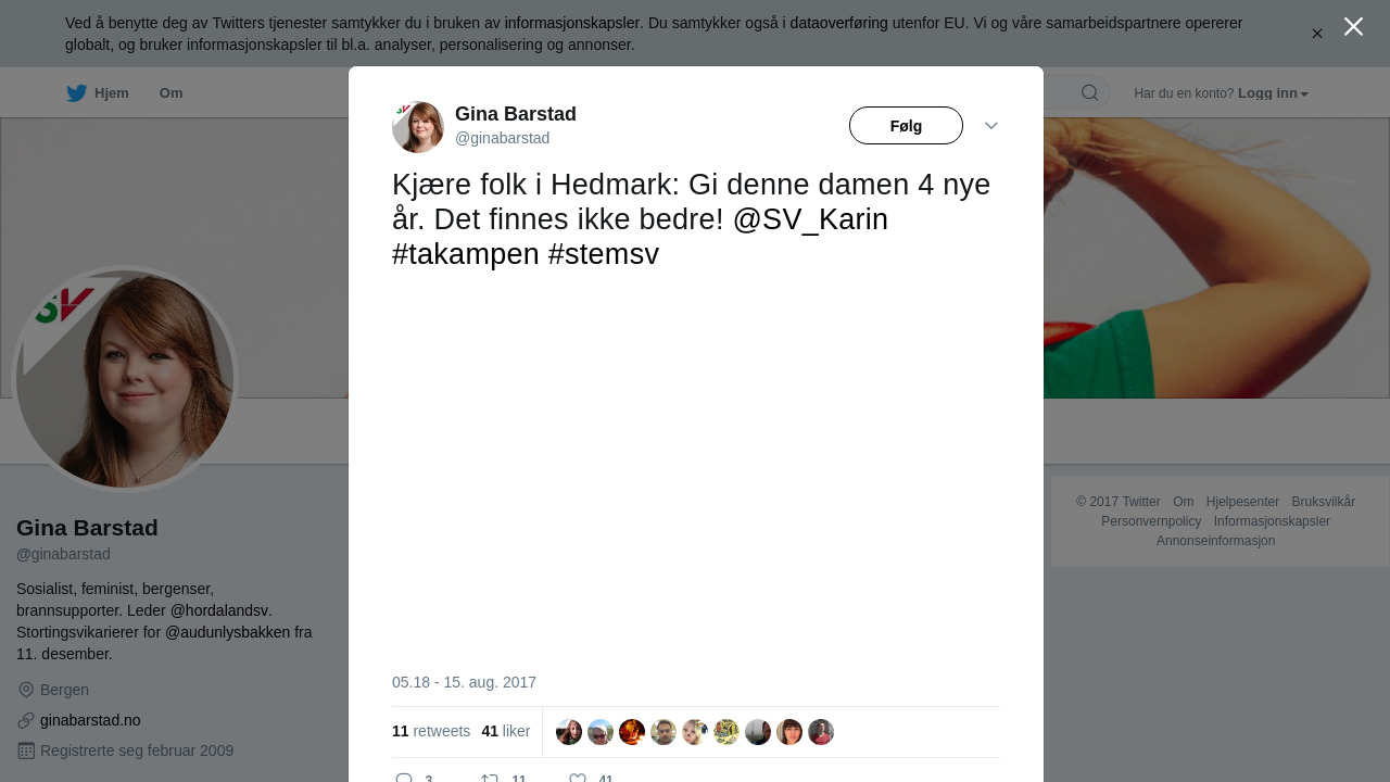RT @ginabarstad: Kjære folk i Hedmark: Gi denne damen 4 nye år. Det finnes ikke bedre! @SV_Karin #takampen #stemsv https://t.co/WZam4Igw2C