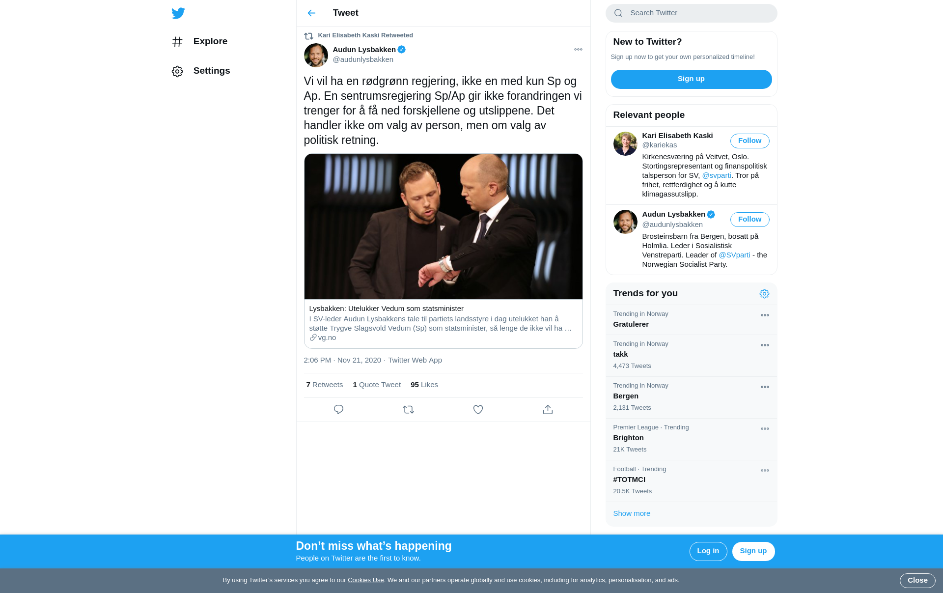 RT @audunlysbakken: Vi vil ha en rødgrønn regjering, ikke en med kun Sp og Ap. En sentrumsregjering Sp/Ap gir ikke forandringen vi trenger for å få ned forskjellene og utslippene. Det handler ikke om valg av person, men om valg av politisk retning. https://t.co/e0J2oVwWzX