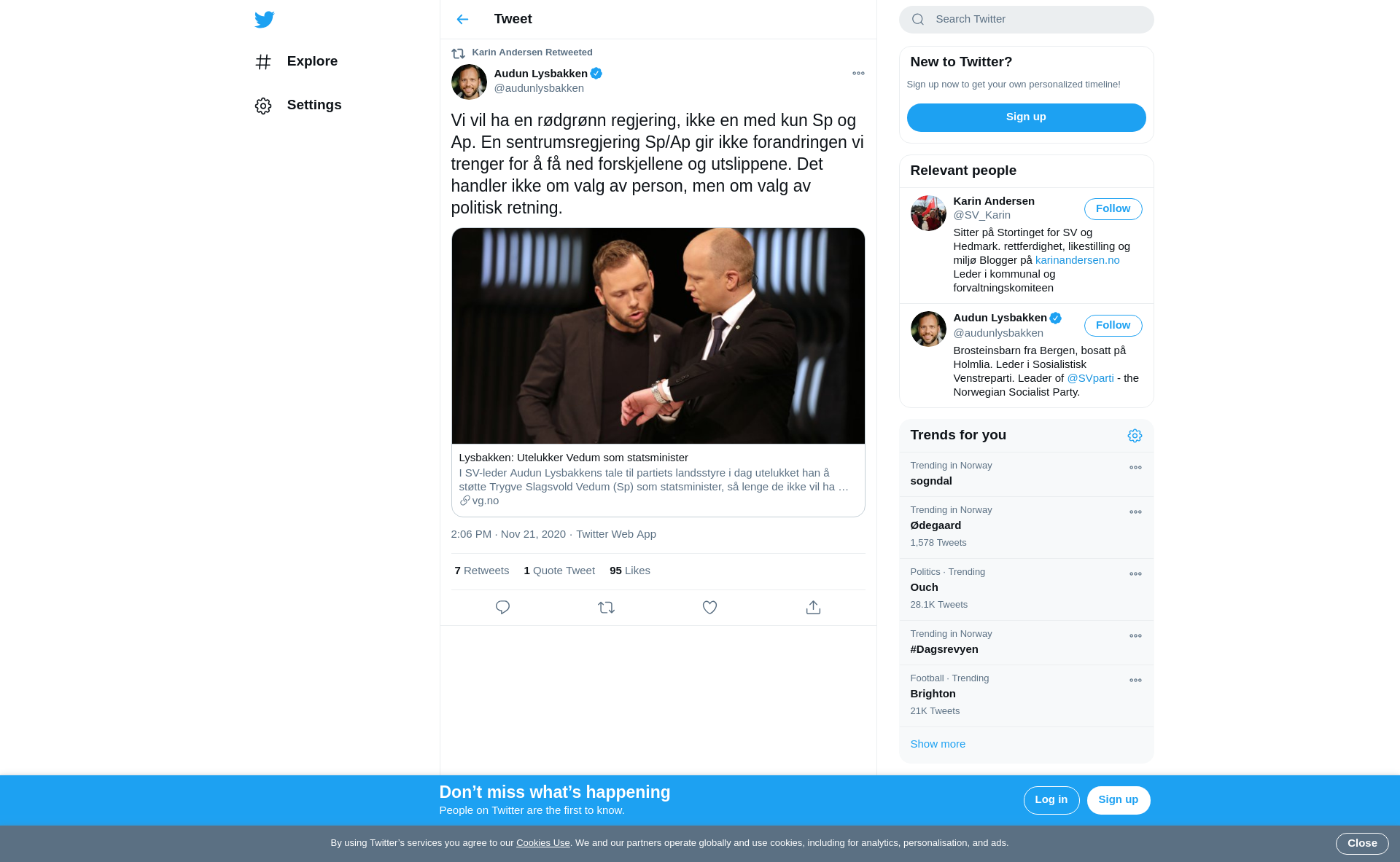 RT @audunlysbakken: Vi vil ha en rødgrønn regjering, ikke en med kun Sp og Ap. En sentrumsregjering Sp/Ap gir ikke forandringen vi trenger for å få ned forskjellene og utslippene. Det handler ikke om valg av person, men om valg av politisk retning. https://t.co/e0J2oVwWzX