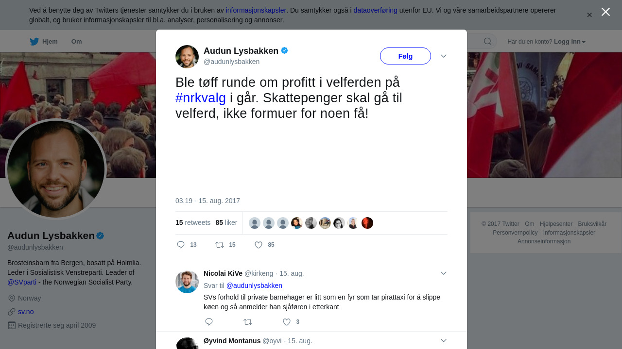 RT @audunlysbakken: Ble tøff runde om profitt i velferden på #nrkvalg i går. Skattepenger skal gå til velferd, ikke formuer for noen få! https://t.co/Q2nc4rfnoZ