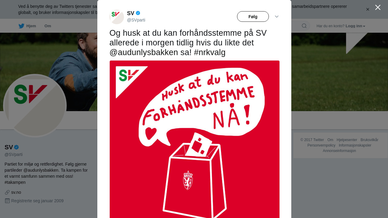 Og husk at du kan forhåndsstemme på SV allerede i morgen tidlig hvis du likte det @audunlysbakken sa! #nrkvalg https://t.co/E38zm3wYOY