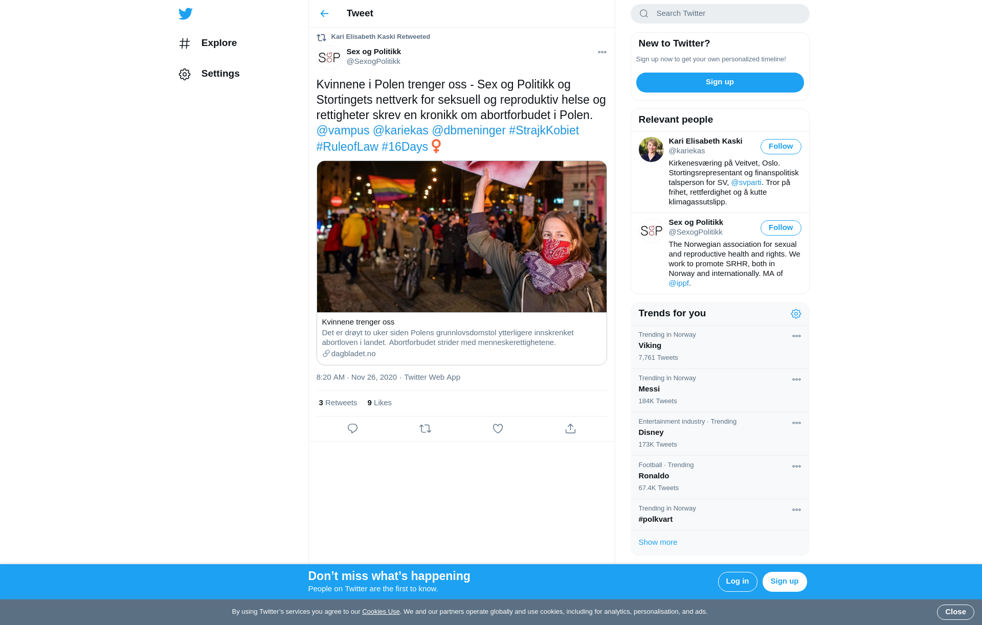 RT @SexogPolitikk: Kvinnene i Polen trenger oss - Sex og Politikk og Stortingets nettverk for seksuell og reproduktiv helse og rettigheter skrev en kronikk om abortforbudet i Polen. @vampus @kariekas @dbmeninger #StrajkKobiet #RuleofLaw #16Days