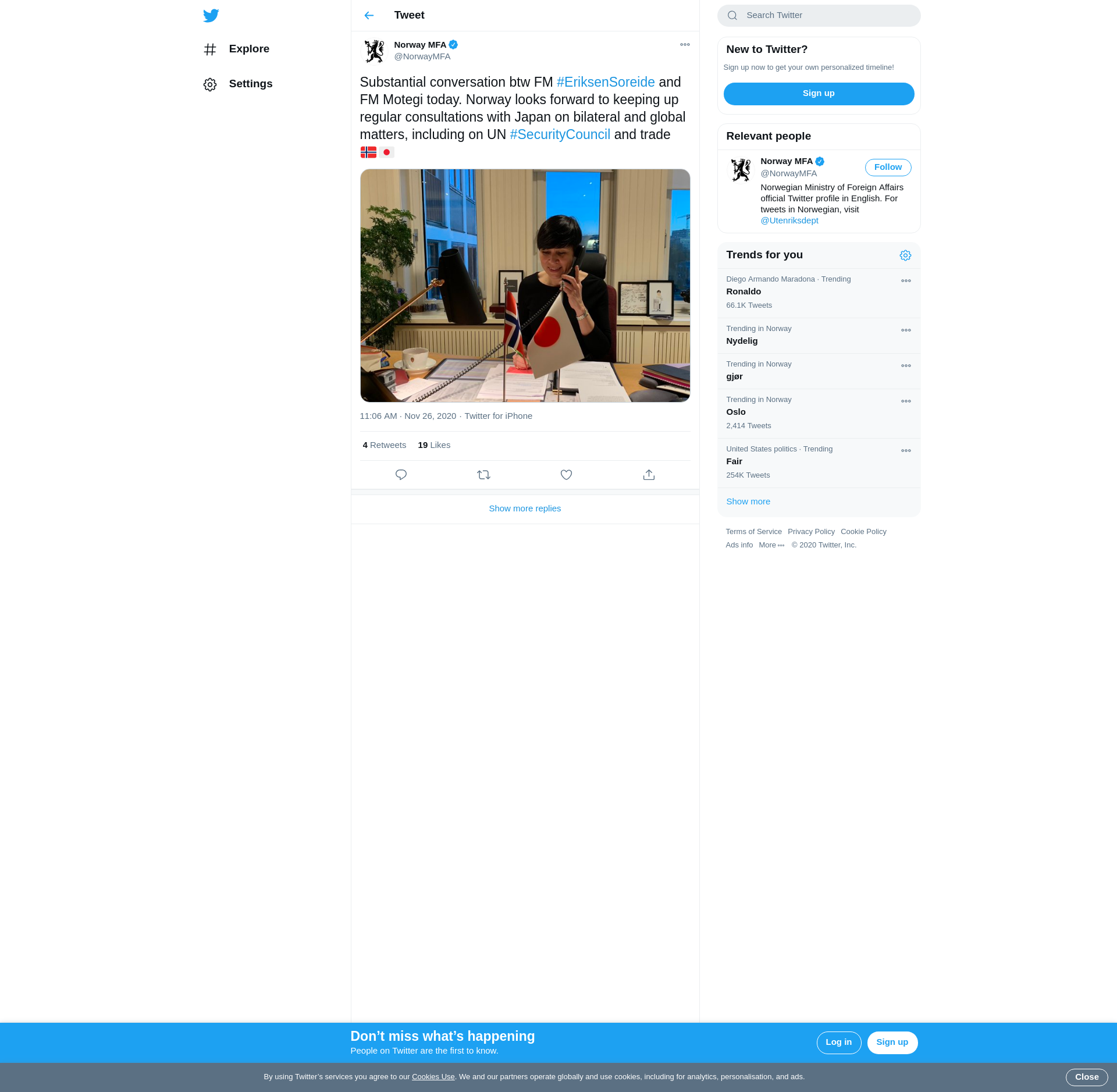 Substantial conversation btw FM #EriksenSoreide and FM Motegi today. Norway looks forward to keeping up regular consultations with Japan on bilateral and global matters, including on UN #SecurityCouncil and trade 🇳🇴🇯🇵 https://t.co/pv2mNNysBB