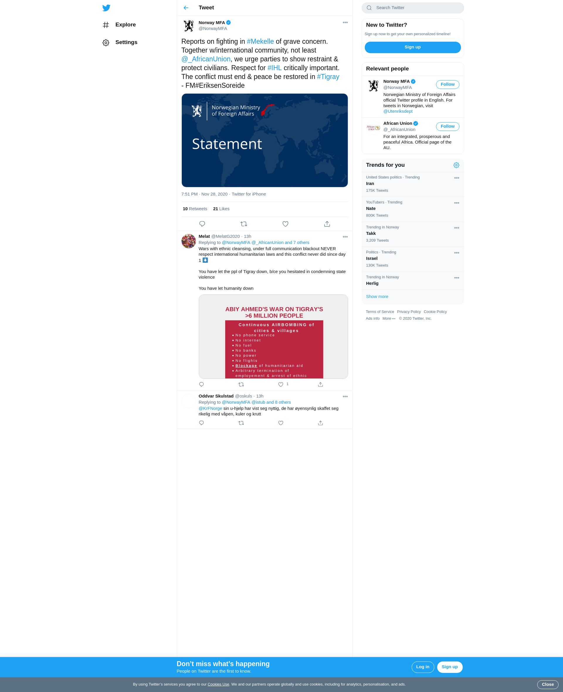 Reports on fighting in #Mekelle of grave concern. Together w/international community, not least @_AfricanUnion, we urge parties to show restraint & protect civilians. Respect for #IHL critically important. The conflict must end & peace be restored in #Tigray