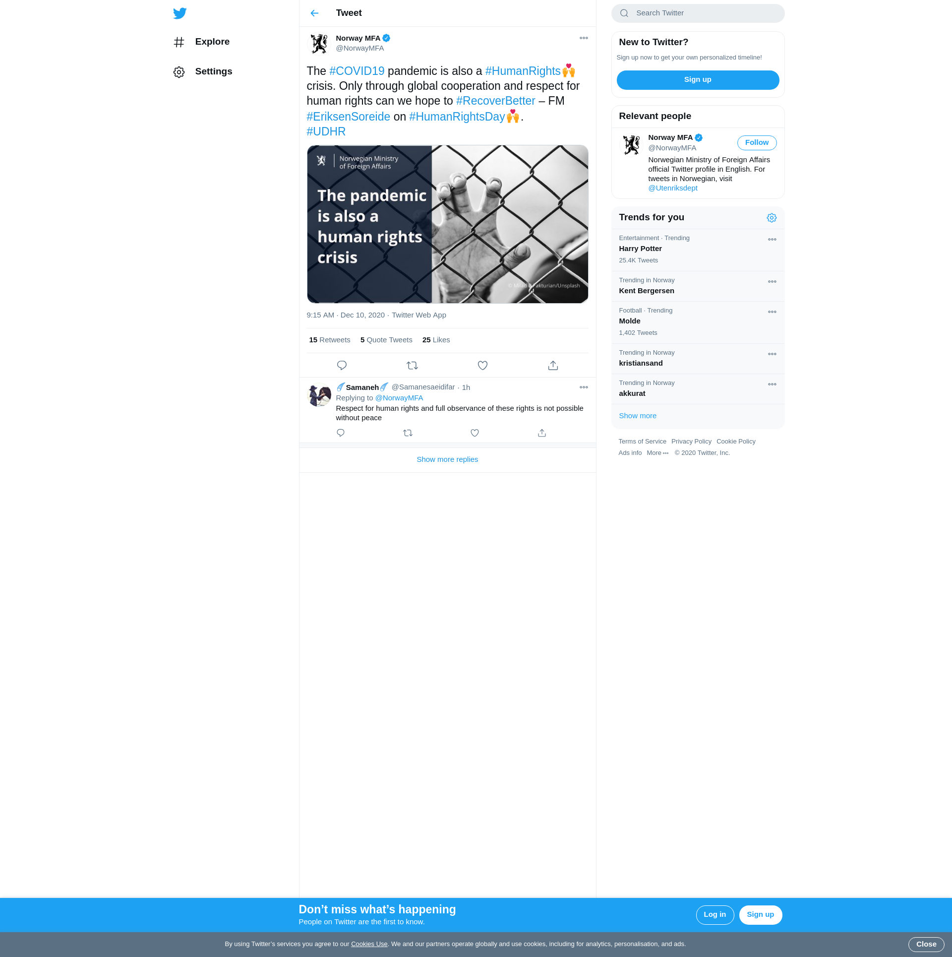 The #COVID19 pandemic is also a #HumanRights crisis. Only through global cooperation and respect for human rights can we hope to #RecoverBetter – FM #EriksenSoreide on #HumanRightsDay.