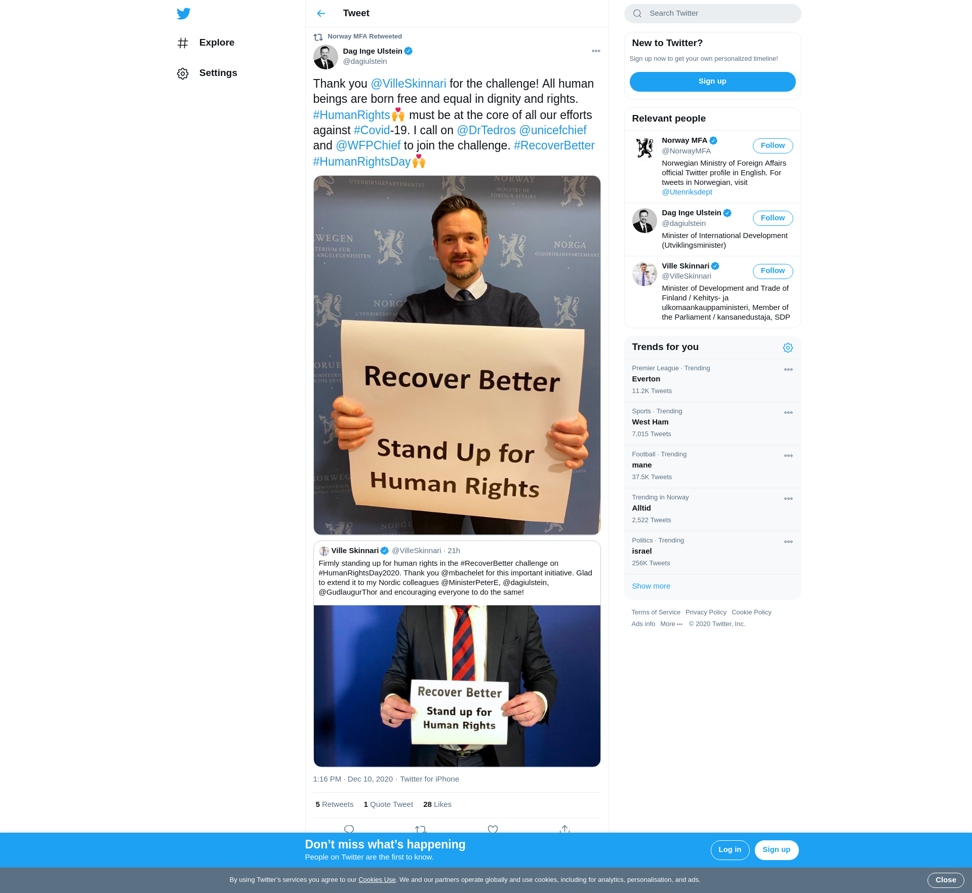 RT @dagiulstein: Thank you @VilleSkinnari for the challenge! All human beings are born free and equal in dignity and rights. #HumanRights must be at the core of all our efforts against #Covid-19. I call on @DrTedros @unicefchief and @WFPChief to join the challenge. #RecoverBetter #HumanRightsDay https://t.co/9IAdzllohg