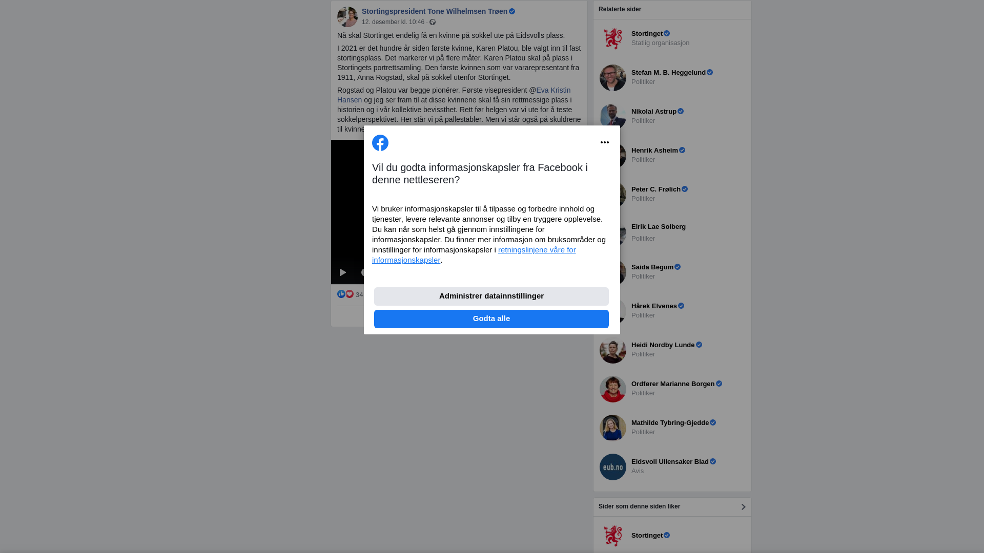 I 2021 er det hundre år siden første kvinne, Karen Platou, ble valgt inn til fast stortingsplass. Det markerer vi på flere måter. Karen Platou skal på plass i Stortingets portrettsamling. Den første kvinnen som var vararepresentant fra 1911, Anna Rogstad, skal på sokkel utenfor Stortinget.
