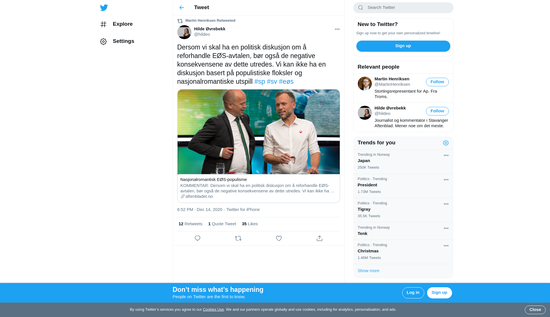 RT @hildeo: Dersom vi skal ha en politisk diskusjon om å reforhandle EØS-avtalen, bør også de negative konsekvensene av dette utredes. Vi kan ikke ha en diskusjon basert på populistiske floksler og nasjonalromantiske utspill #sp #sv #eøs https://t.co/csjpmVUrFn