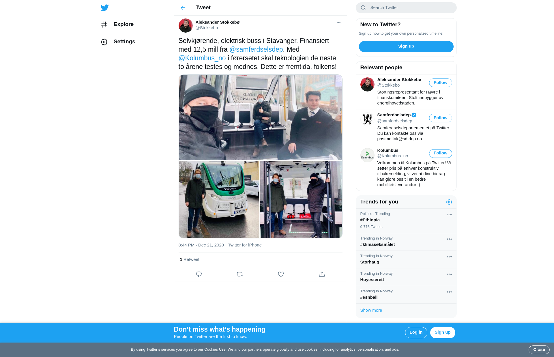 Selvkjørende, elektrisk buss i Stavanger. Finansiert med 12,5 mill fra @samferdselsdep. Med @Kolumbus_no i førersetet skal teknologien de neste to årene testes og modnes. Dette er fremtida, folkens! https://t.co/15K5W1l7ZQ