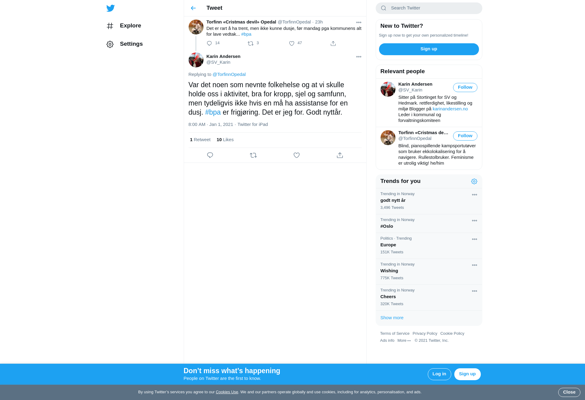 @TorfinnOpedal Var det noen som nevnte folkehelse og at vi skulle holde oss i aktivitet, bra for kropp, sjel og samfunn, men tydeligvis ikke hvis en må ha assistanse for en dusj. #bpa er frigjøring. Det er jeg for. Godt nyttår.