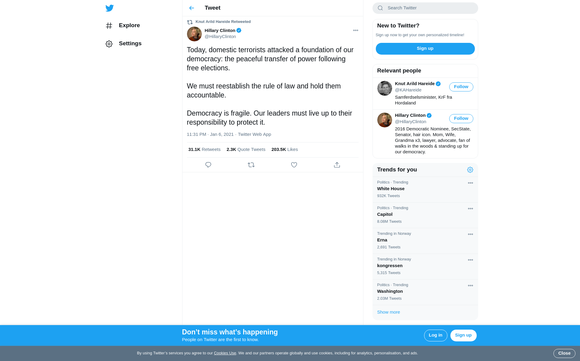 RT @HillaryClinton: Today, domestic terrorists attacked a foundation of our democracy: the peaceful transfer of power following free elections.