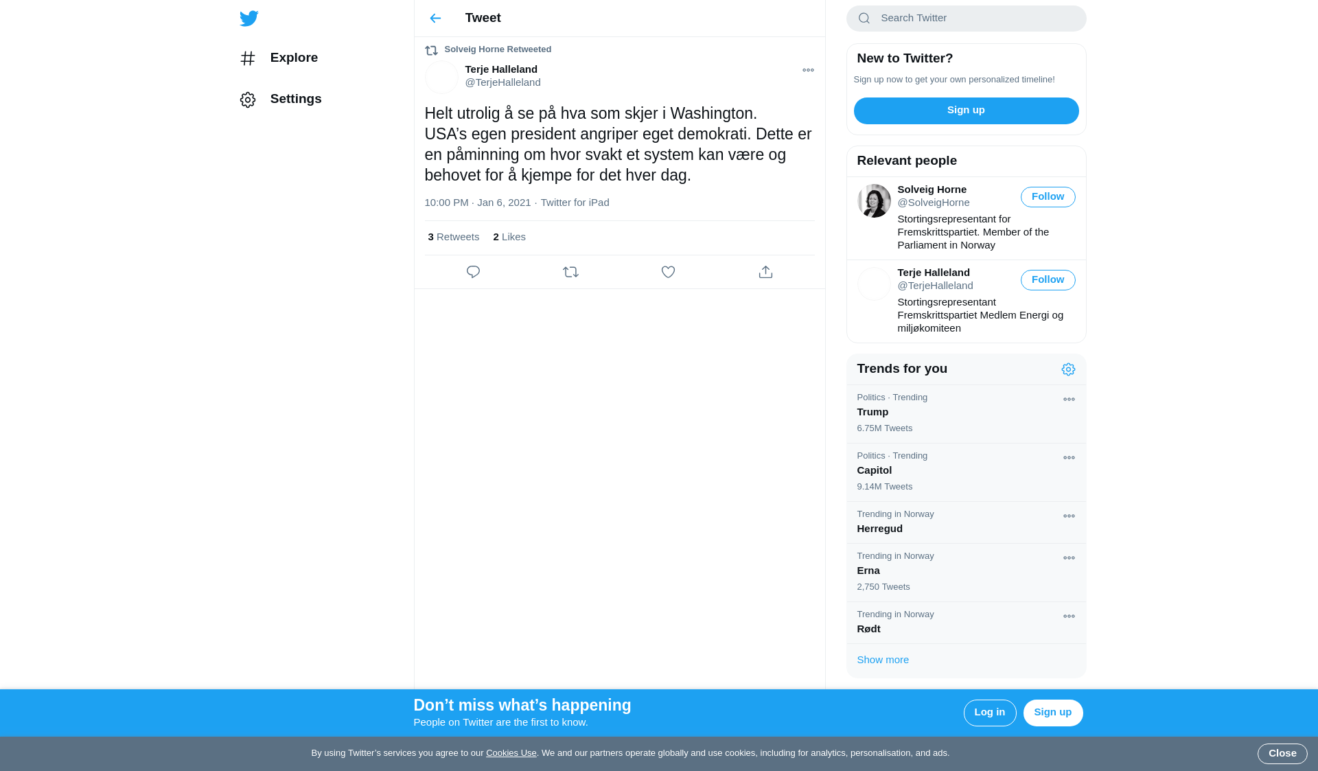 RT @TerjeHalleland: Helt utrolig å se på hva som skjer i Washington. USA’s egen president angriper eget demokrati. Dette er en påminning o…