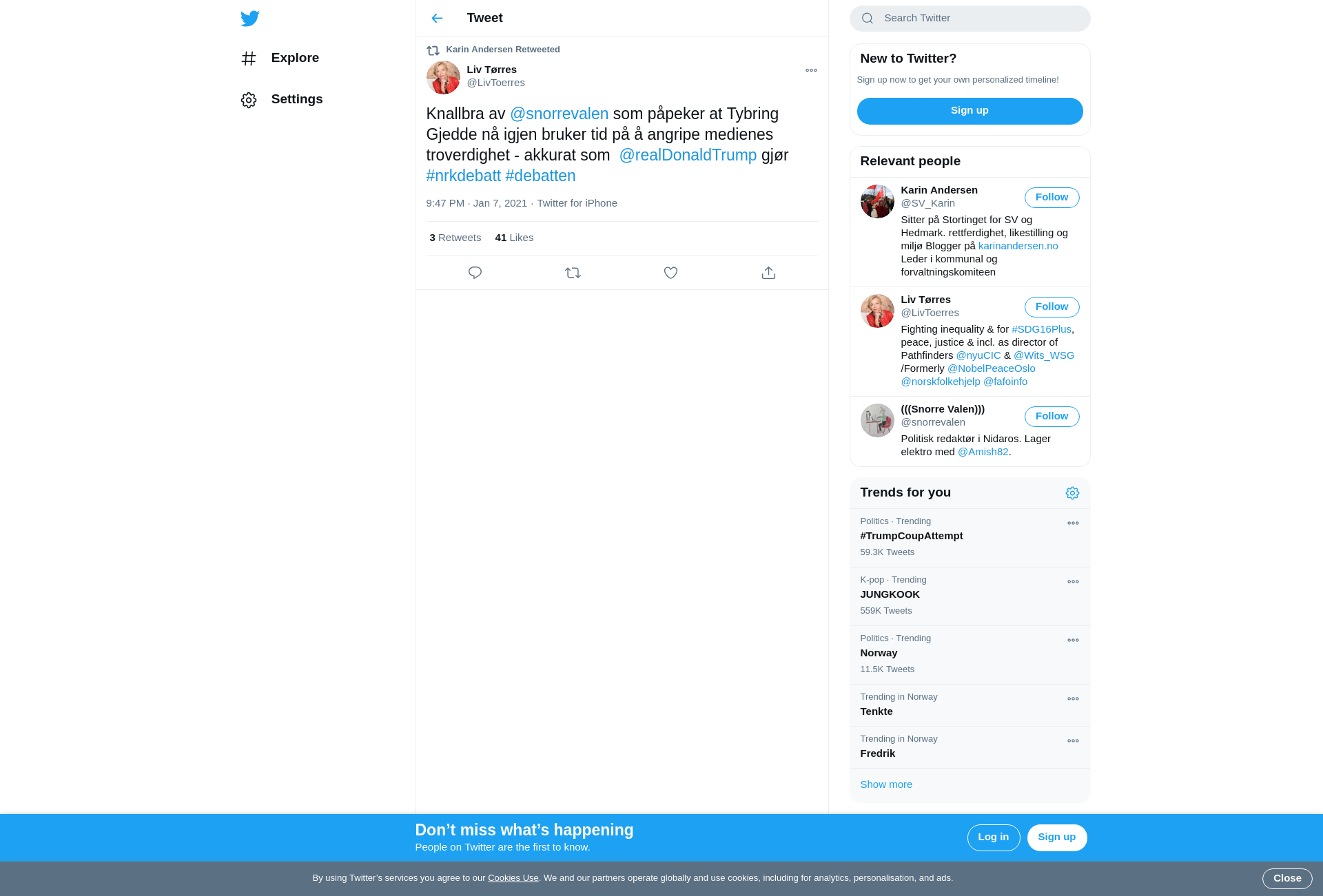 RT @LivToerres: Knallbra av @snorrevalen som påpeker at Tybring Gjedde nå igjen bruker tid på å angripe medienes troverdighet - akkurat som @realDonaldTrump gjør #nrkdebatt #debatten