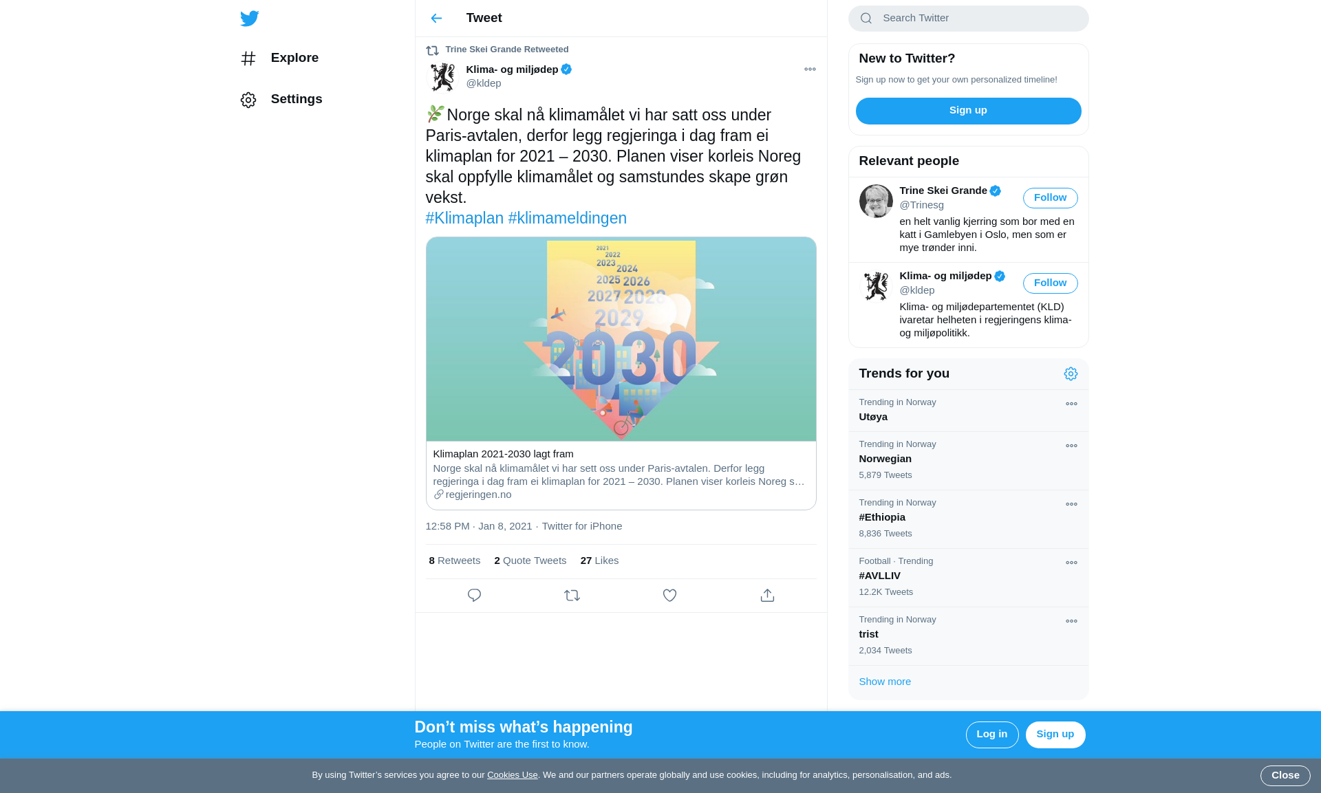 RT @kldep: 🌿Norge skal nå klimamålet vi har satt oss under Paris-avtalen, derfor legg regjeringa i dag fram ei klimaplan for 2021 – 2030. Planen viser korleis Noreg skal oppfylle klimamålet og samstundes skape grøn vekst.