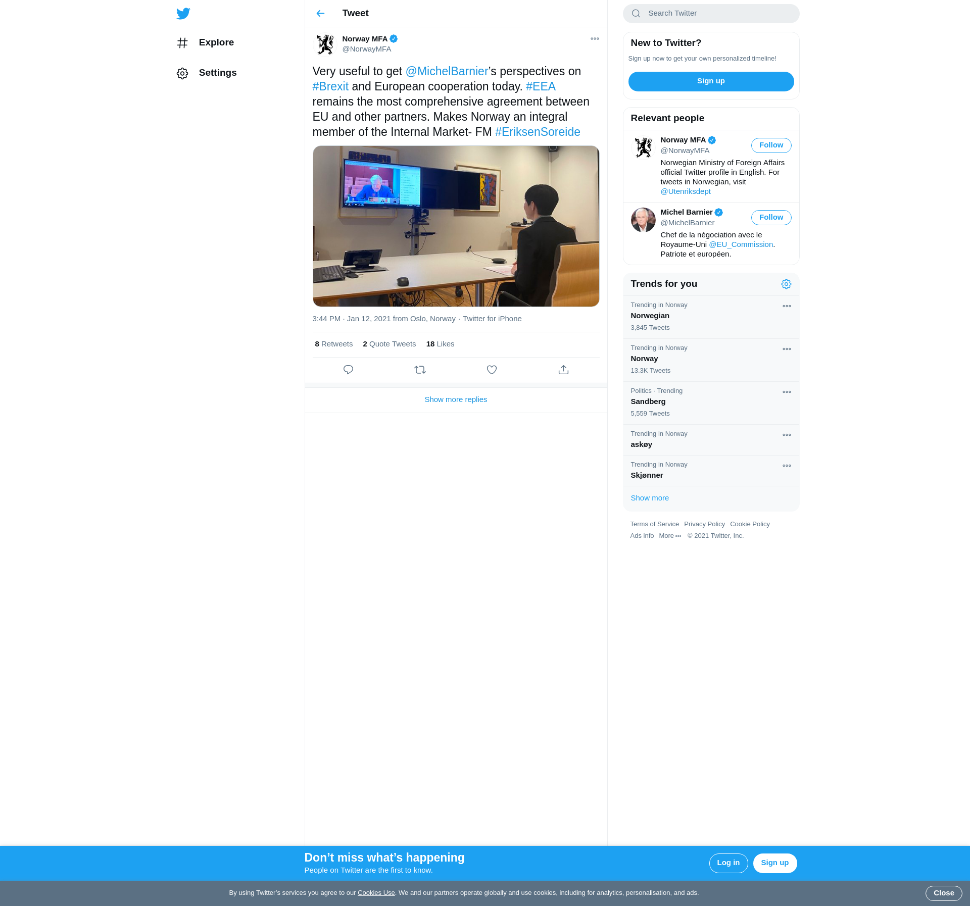 Very useful to get @MichelBarnier’s perspectives on #Brexit and European cooperation today. #EEA remains the most comprehensive agreement between EU and other partners. Makes Norway an integral member of the Internal Market- FM #EriksenSoreide https://t.co/9eCx8MlfQH