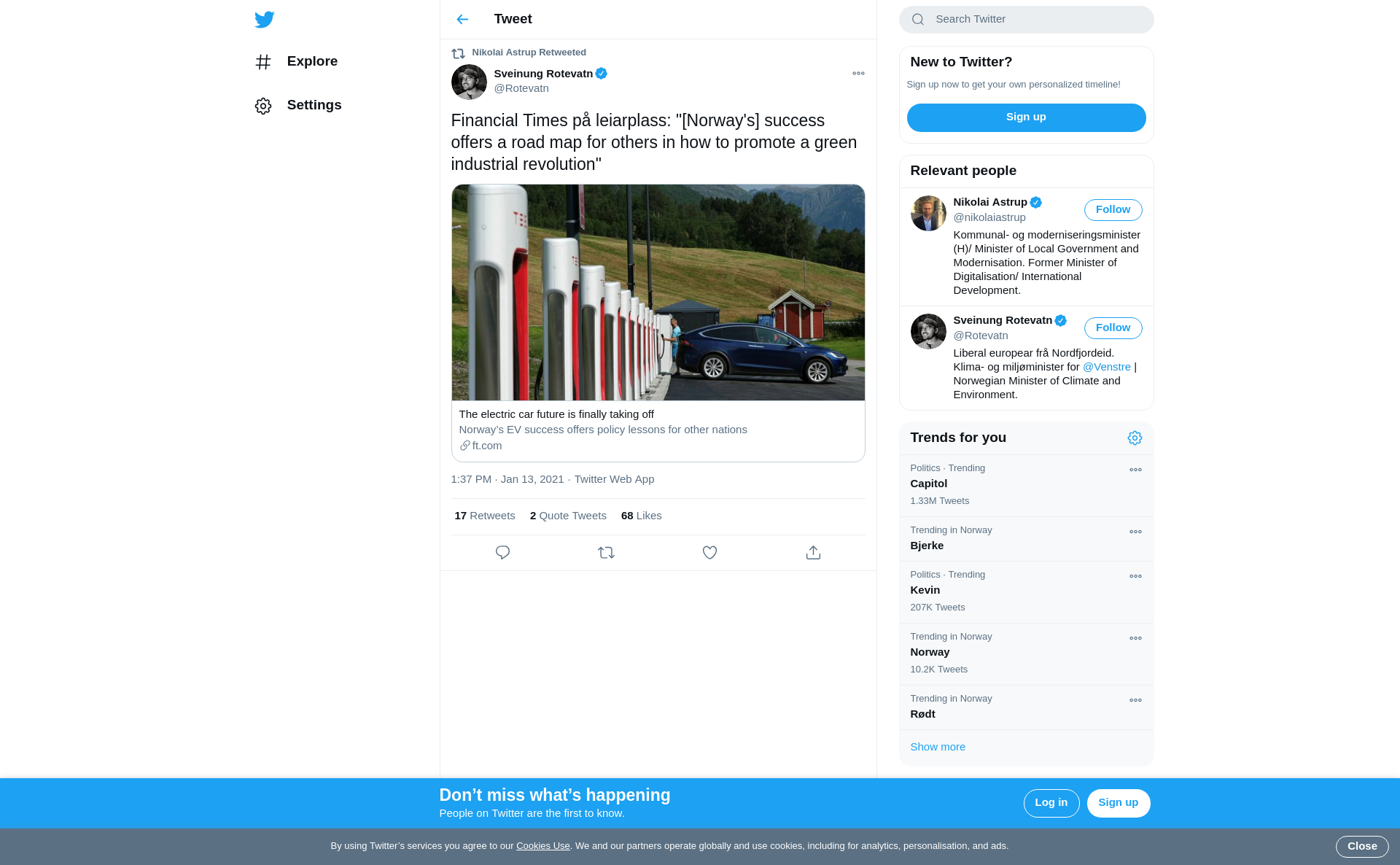 RT @Rotevatn: Financial Times på leiarplass: "[Norway's] success offers a road map for others in how to promote a green industrial revolution" https://t.co/StdDrKWsfF