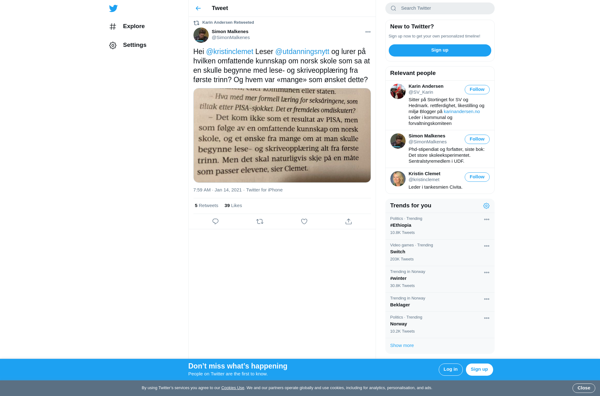 RT @SimonMalkenes: Hei @kristinclemet Leser @utdanningsnytt og lurer på hvilken omfattende kunnskap om norsk skole som sa at en skulle begynne med lese- og skriveopplæring fra første trinn? Og hvem var «mange» som ønsket dette? https://t.co/cRWd0BHsSo