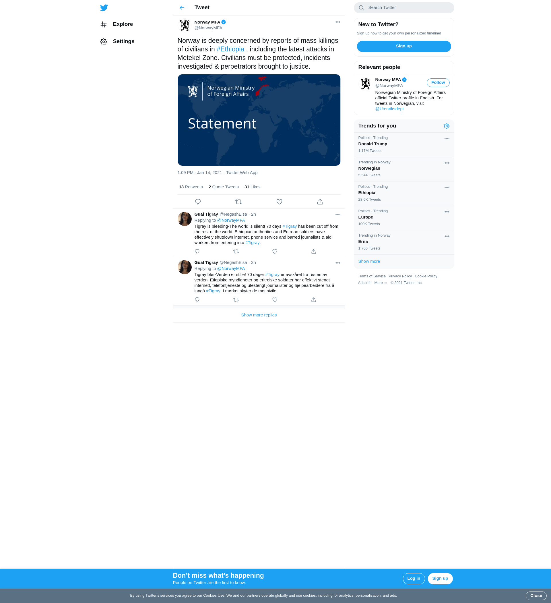 Norway is deeply concerned by reports of mass killings of civilians in #Ethiopia , including the latest attacks in Metekel Zone. Civilians must be protected, incidents investigated & perpetrators brought to justice. https://t.co/mBhg0HbDJe