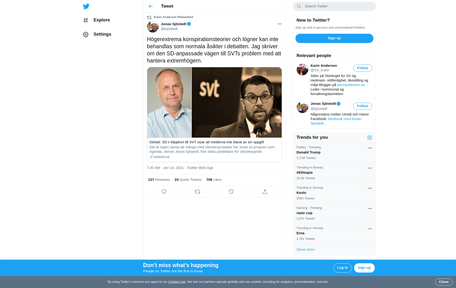 RT @jsjostedt: Högerextrema konspirationsteorier och lögner kan inte behandlas som normala åsikter i debatten. Jag skriver om den SD-anpassade vägen till SVTs problem med att hantera extremhögern.