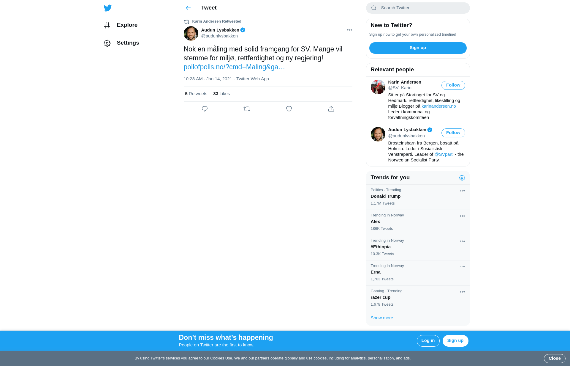 RT @audunlysbakken: Nok en måling med solid framgang for SV. Mange vil stemme for miljø, rettferdighet og ny regjering! https://t.co/FyAeA2IzsP