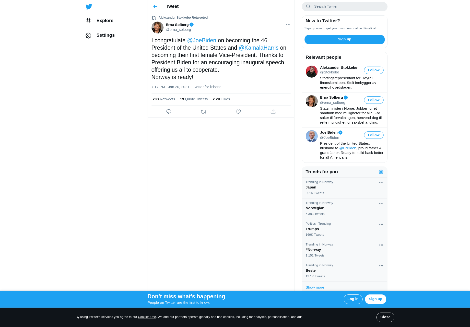 RT @erna_solberg: I congratulate @JoeBiden on becoming the 46. President of the United States and @KamalaHarris on becoming their first female Vice-President. Thanks to President Biden for an encouraging inaugural speech offering us all to cooperate.