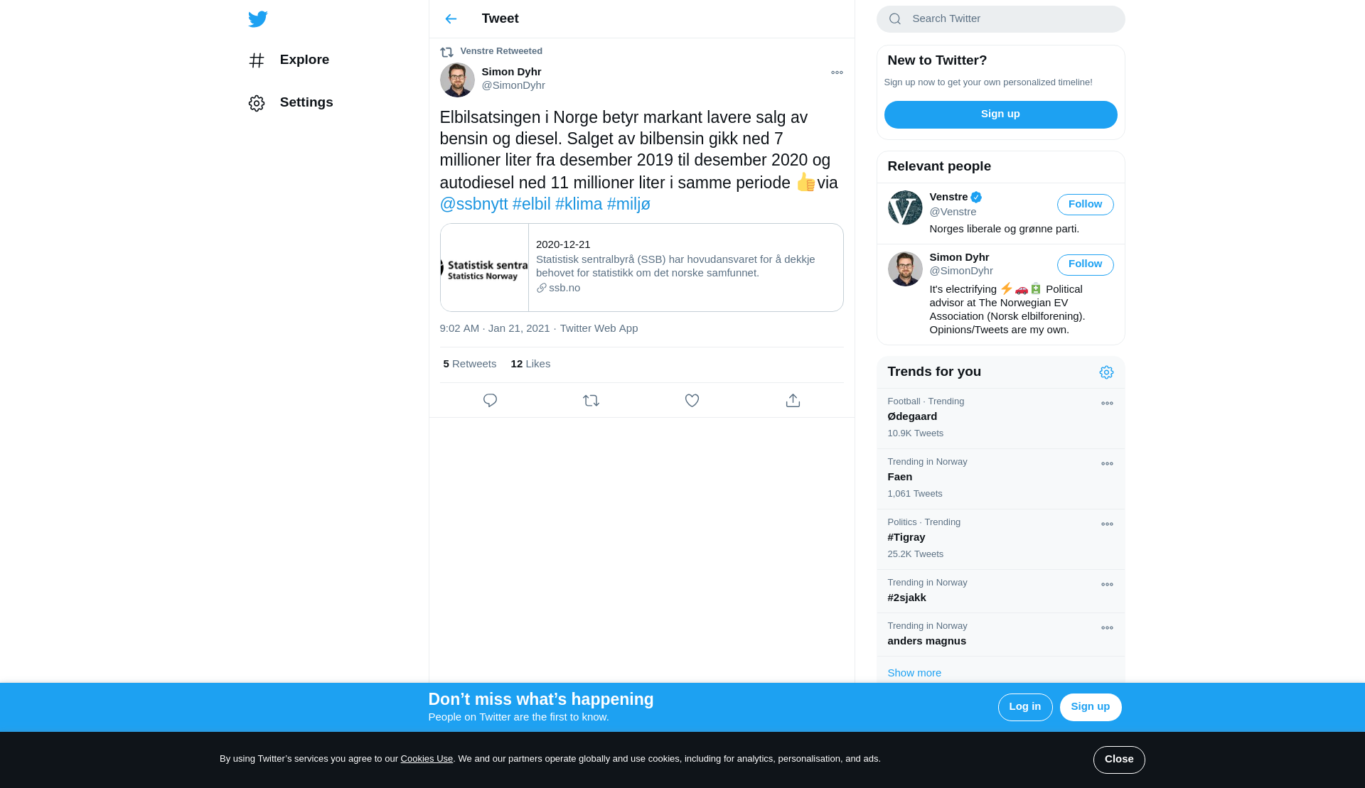 RT @SimonDyhr: Elbilsatsingen i Norge betyr markant lavere salg av bensin og diesel. Salget av bilbensin gikk ned 7 millioner liter fra desember 2019 til desember 2020 og autodiesel ned 11 millioner liter i samme periode 👍via @ssbnytt #elbil #klima #miljø