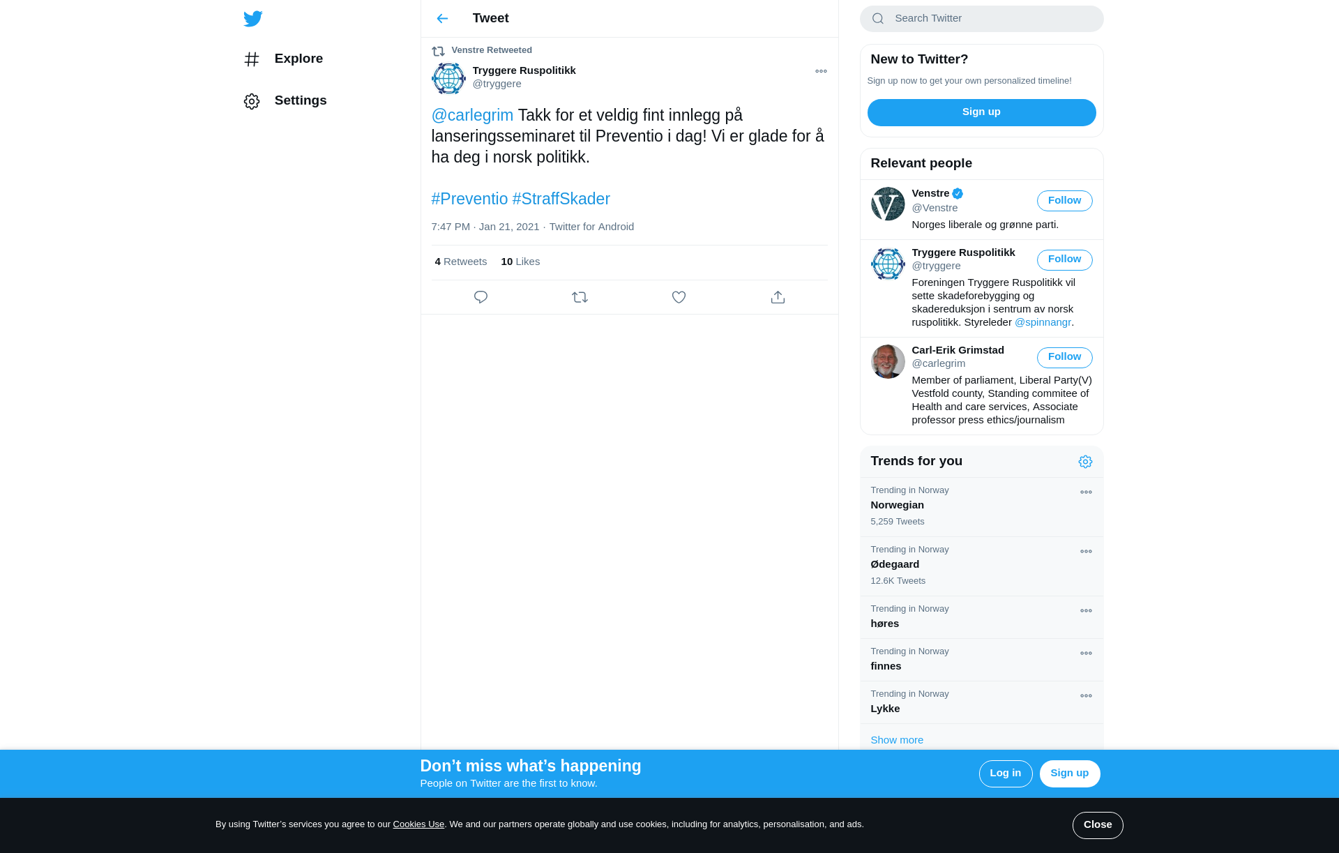 RT @tryggere: @carlegrim Takk for et veldig fint innlegg på lanseringsseminaret til Preventio i dag! Vi er glade for å ha deg i norsk politikk. #Preventio #StraffSkader