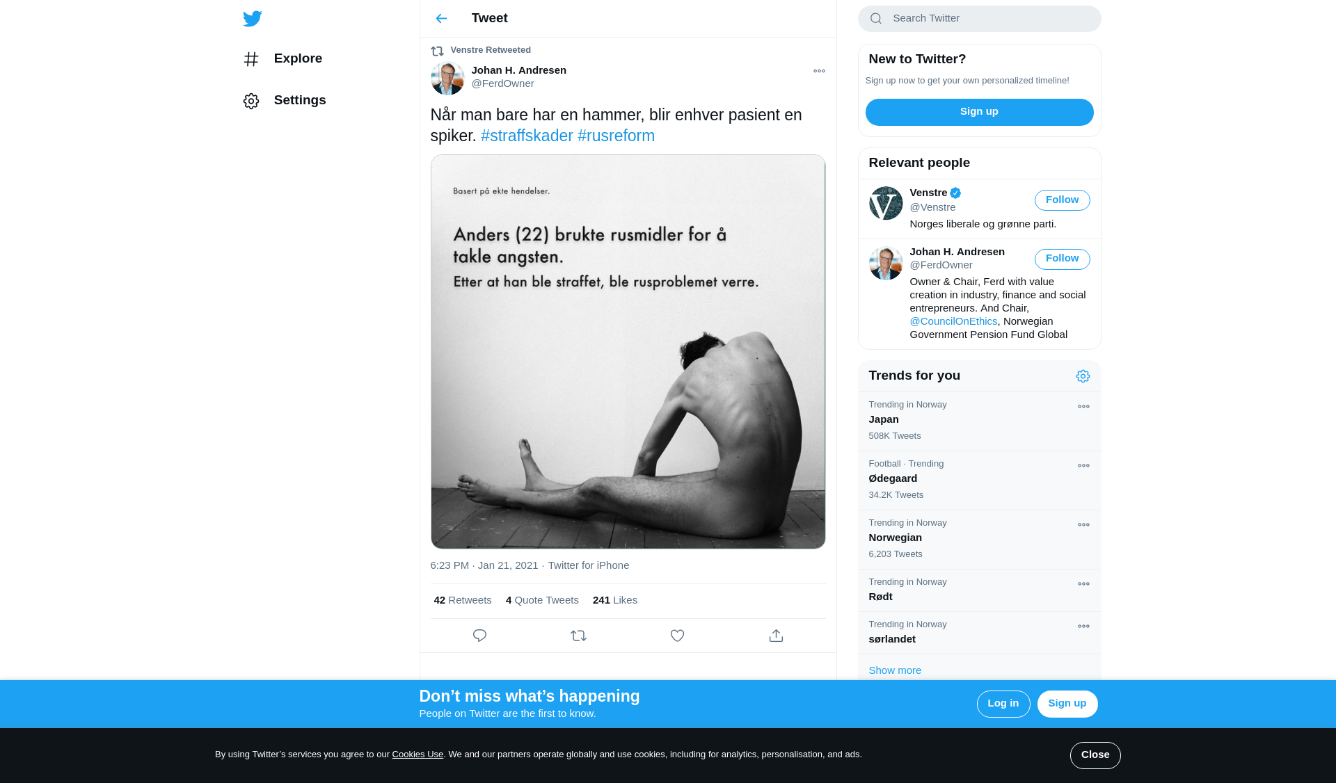 RT @FerdOwner: Når man bare har en hammer, blir enhver pasient en spiker. #straffskader #rusreform https://t.co/0Q0yEsOAcY