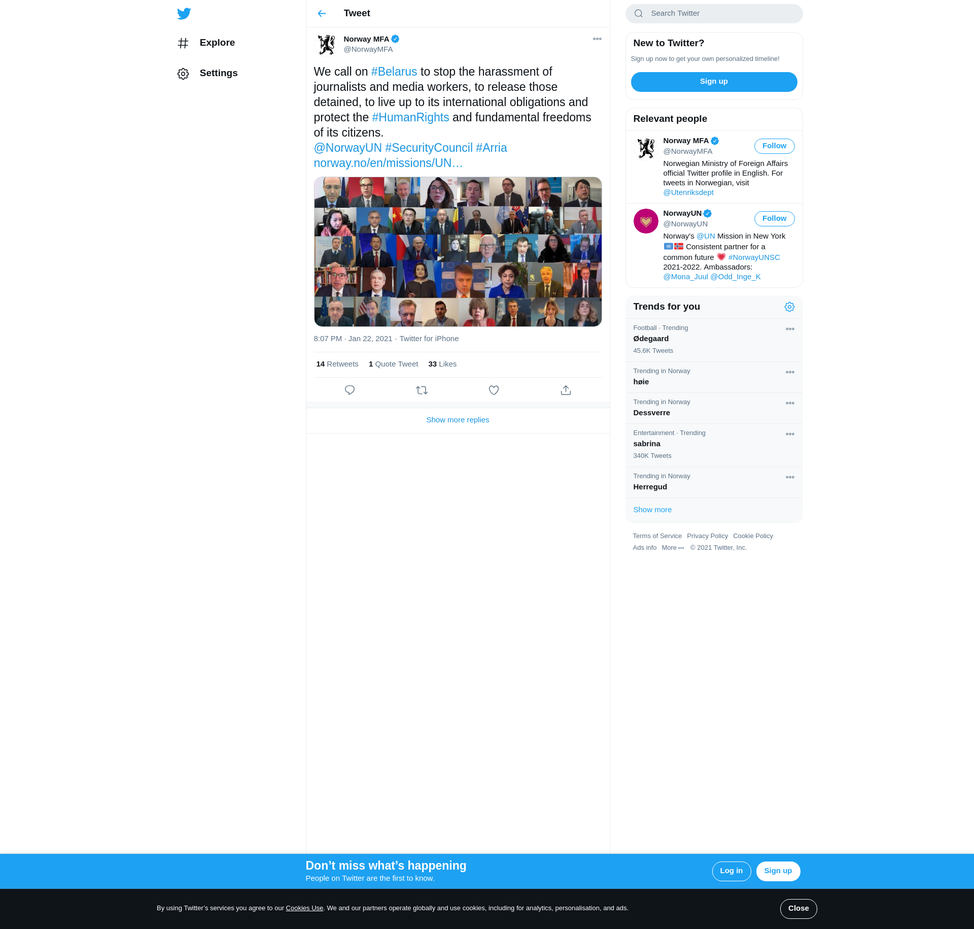 Statement by Ambassador Mona Juul on the Arria-meeting on Press Freedom in Belarus, 22 January 2021. We welcome the opportunity for dialogue on this issue today and thank our co-organisers for the initiative. Belarusian authorities continue to violate human rights on a daily basis. However, today we are highlighting the government's targeting of journalists, bloggers, and othe r media workers. Particularly as part of a larger campaign of harassment and intimidation observed since August. There can be no