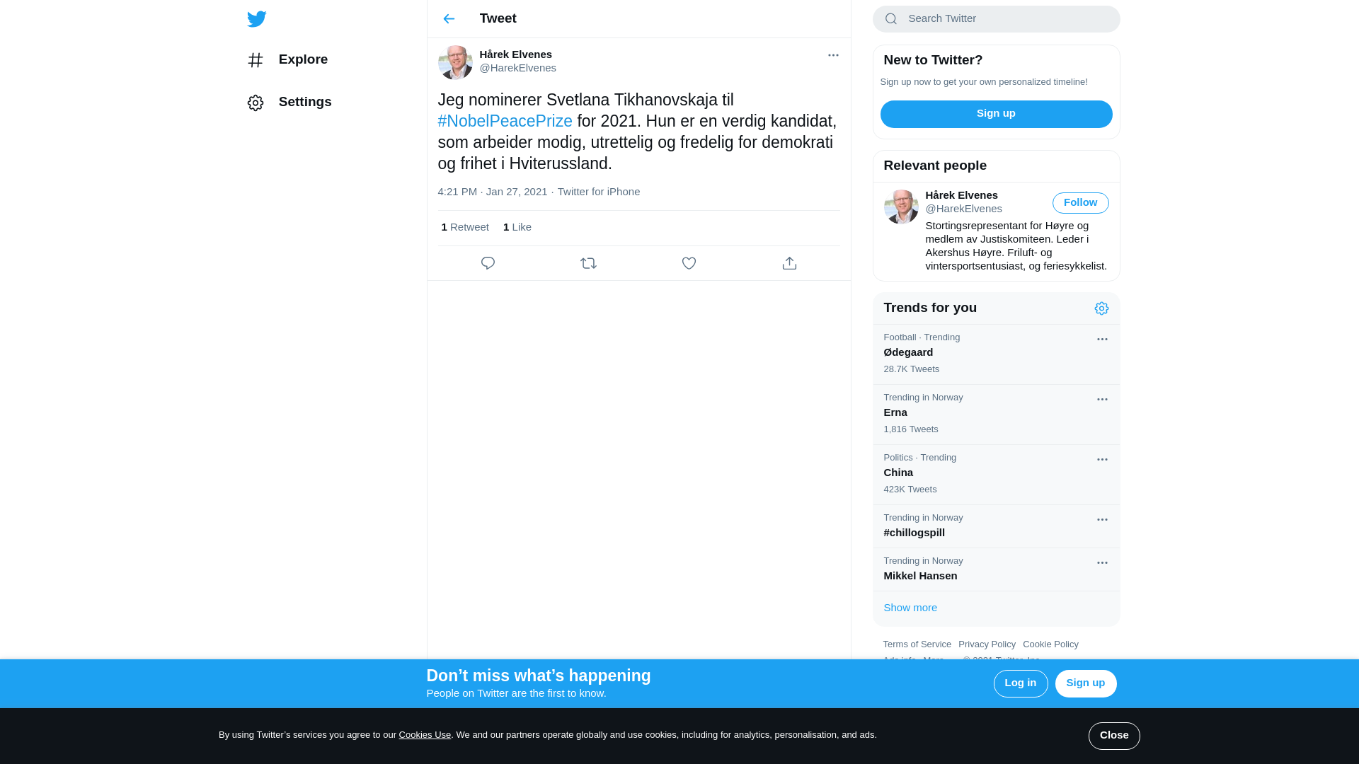 Jeg nominerer Svetlana Tikhanovskaja til #NobelPeacePrize for 2021. Hun er en verdig kandidat, som arbeider modig, utrettelig og fredelig for demokrati og frihet i Hviterussland.