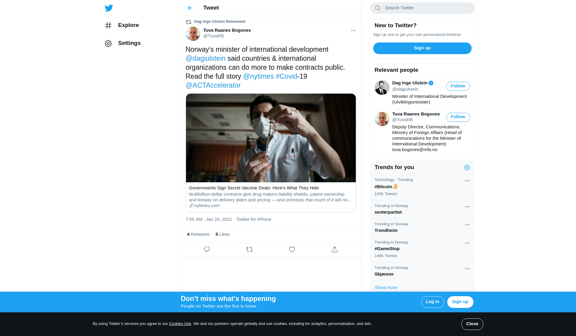 RT @TuvaRB: Norway’s minister of international development @dagiulstein said countries & international organizations can do more to make contracts public. Read the full story @nytimes #Covid-19 @ACTAccelerator  https://t.co/jjo7M63ZK4