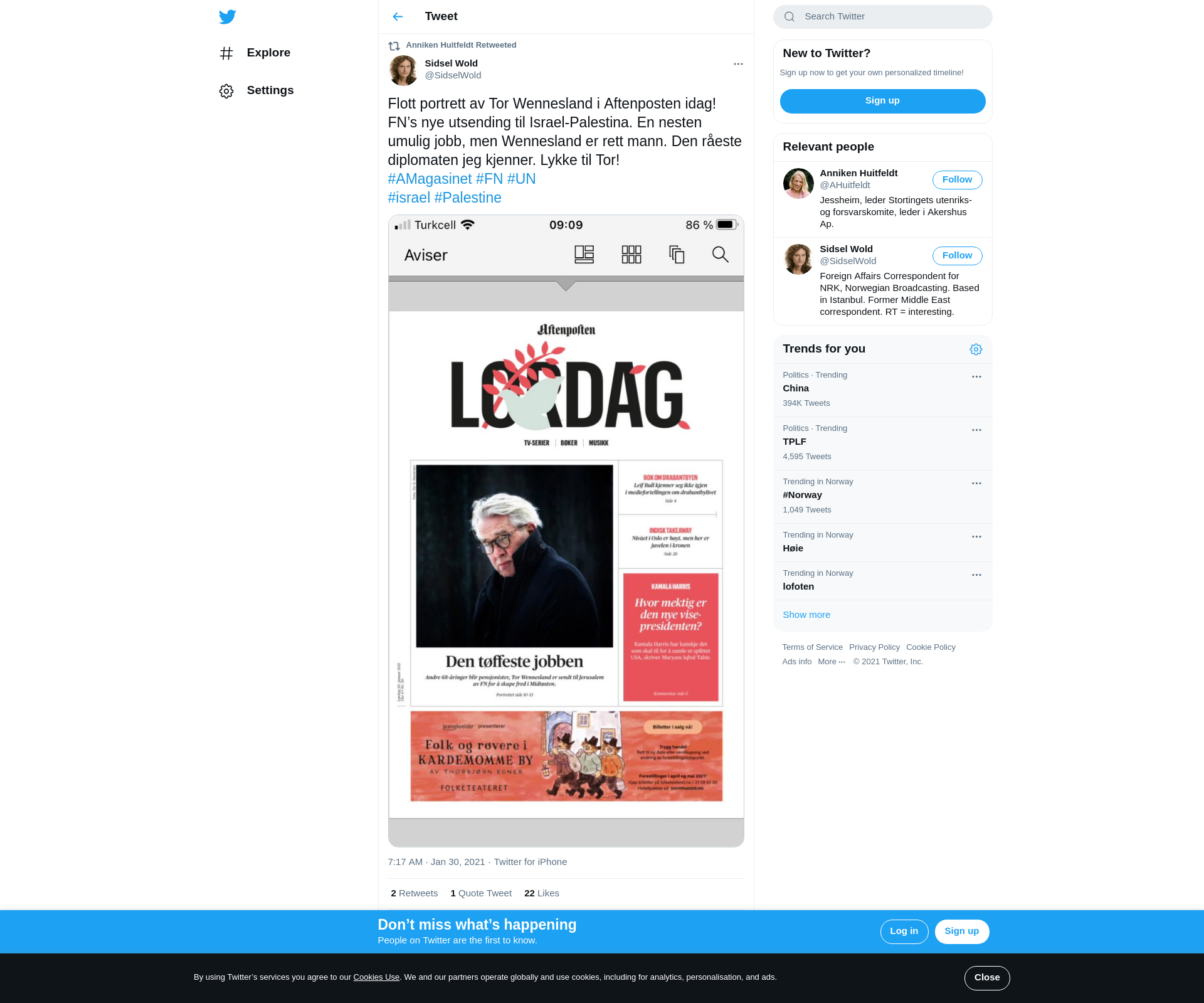 RT @SidselWold: Flott portrett av Tor Wennesland i Aftenposten idag! FN’s nye utsending til Israel-Palestina. En nesten umulig jobb, men Wennesland er rett mann. Den råeste diplomaten jeg kjenner. Lykke til Tor!
