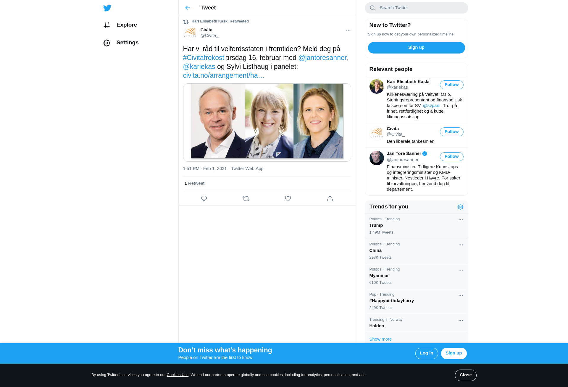RT @Civita_: Har vi råd til velferdsstaten i fremtiden? Meld deg på #Civitafrokost tirsdag 16. februar med @jantoresanner, @kariekas og Sylvi Listhaug i panelet: https://t.co/wQ9Dwcv8IH https://t.co/2HIoumgfGR
