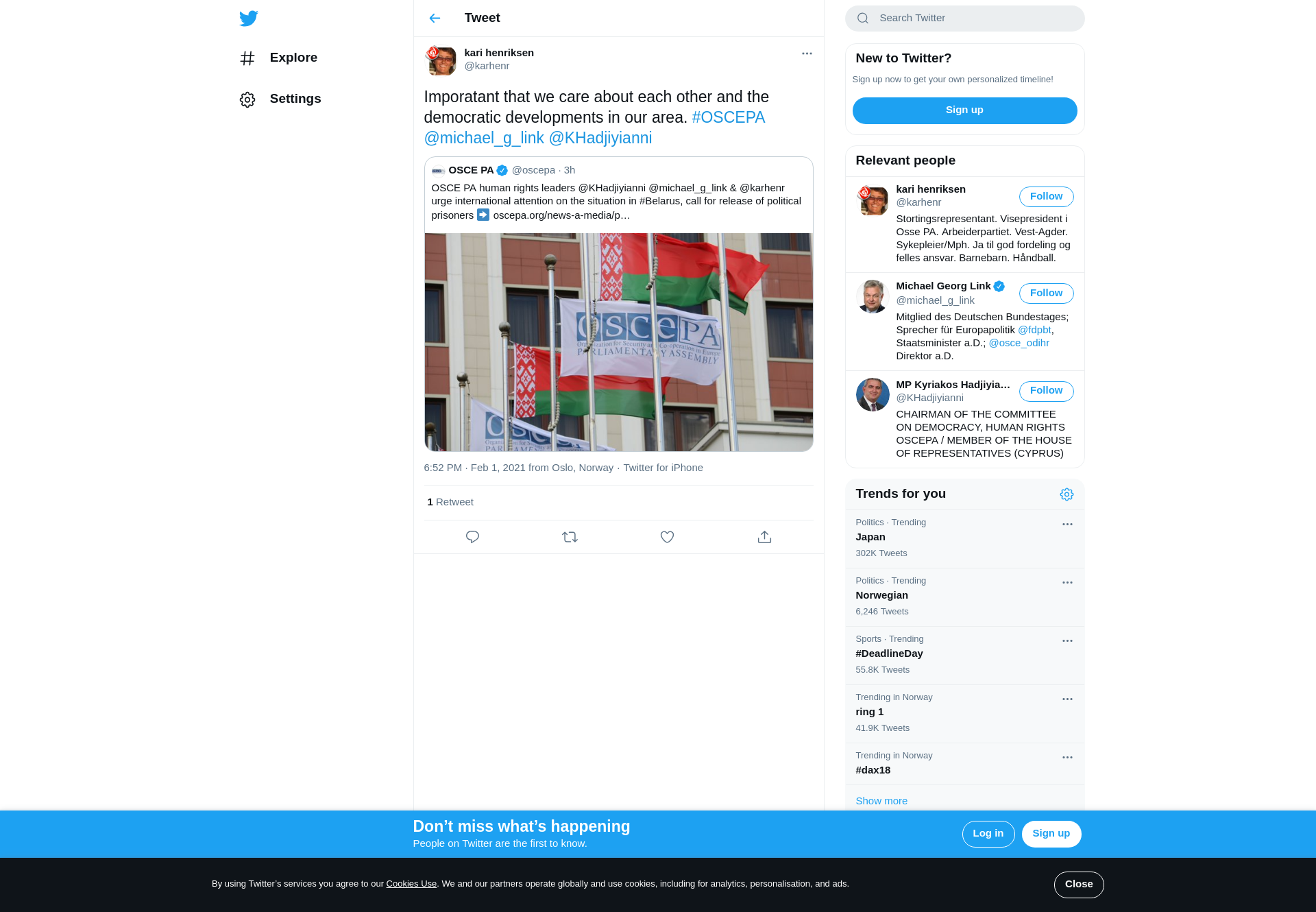 Home / NEWS & MEDIA / Press Releases / 2021 / OSCE PA human rights leaders urge international attention on the situation in Belarus, call for release of political prisoners COPENHAGEN, 1 February 2021 – Recent reports of conditions for detained protesters in Belarus, including widespread allegations of abuse and torture, must be addressed by the international community, said leaders of the OSCE Parliamentary Assembly’s human rights committee today. They highlighted several ongoing cases of political