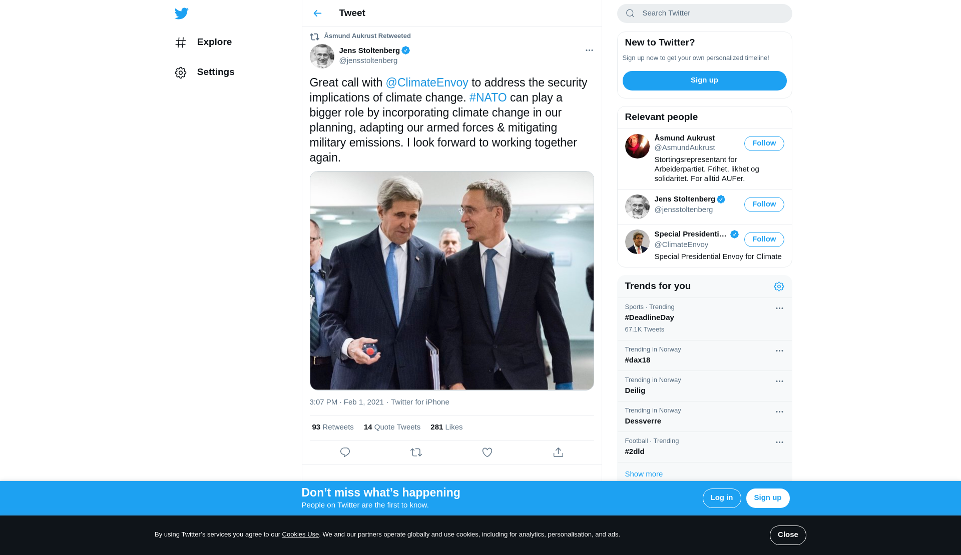 RT @jensstoltenberg: Great call with @ClimateEnvoy to address the security implications of climate change. #NATO can play a bigger role by incorporating climate change in our planning, adapting our armed forces & mitigating military emissions. I look forward to working together again. https://t.co/efoge4tAKT