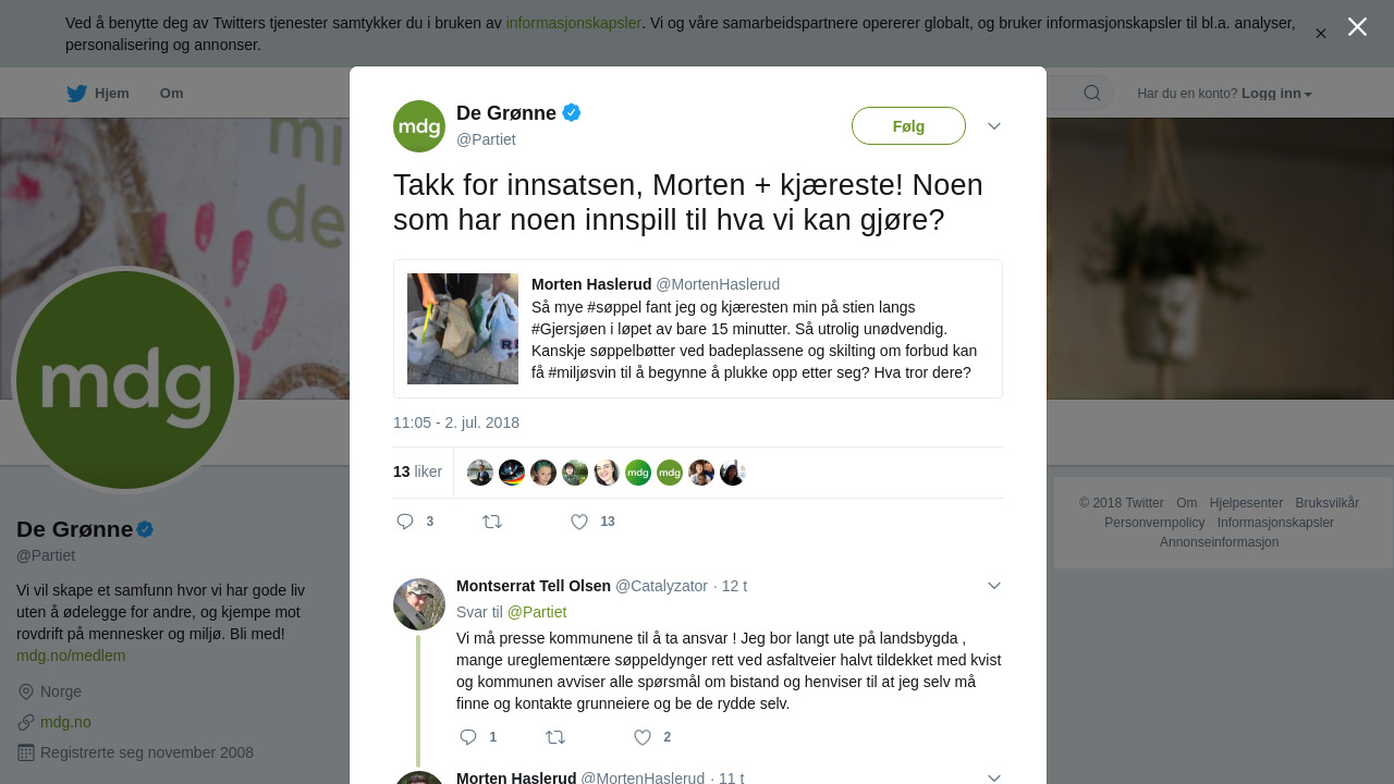 “Så mye #søppel fant jeg og kjæresten min på stien langs #Gjersjøen i løpet av bare 15 minutter. Så utrolig unødvendig. Kanskje søppelbøtter ved badeplassene og skilting om forbud kan få #miljøsvin til å begynne å plukke opp etter seg? Hva tror dere? @shabanarehman @Partiet”