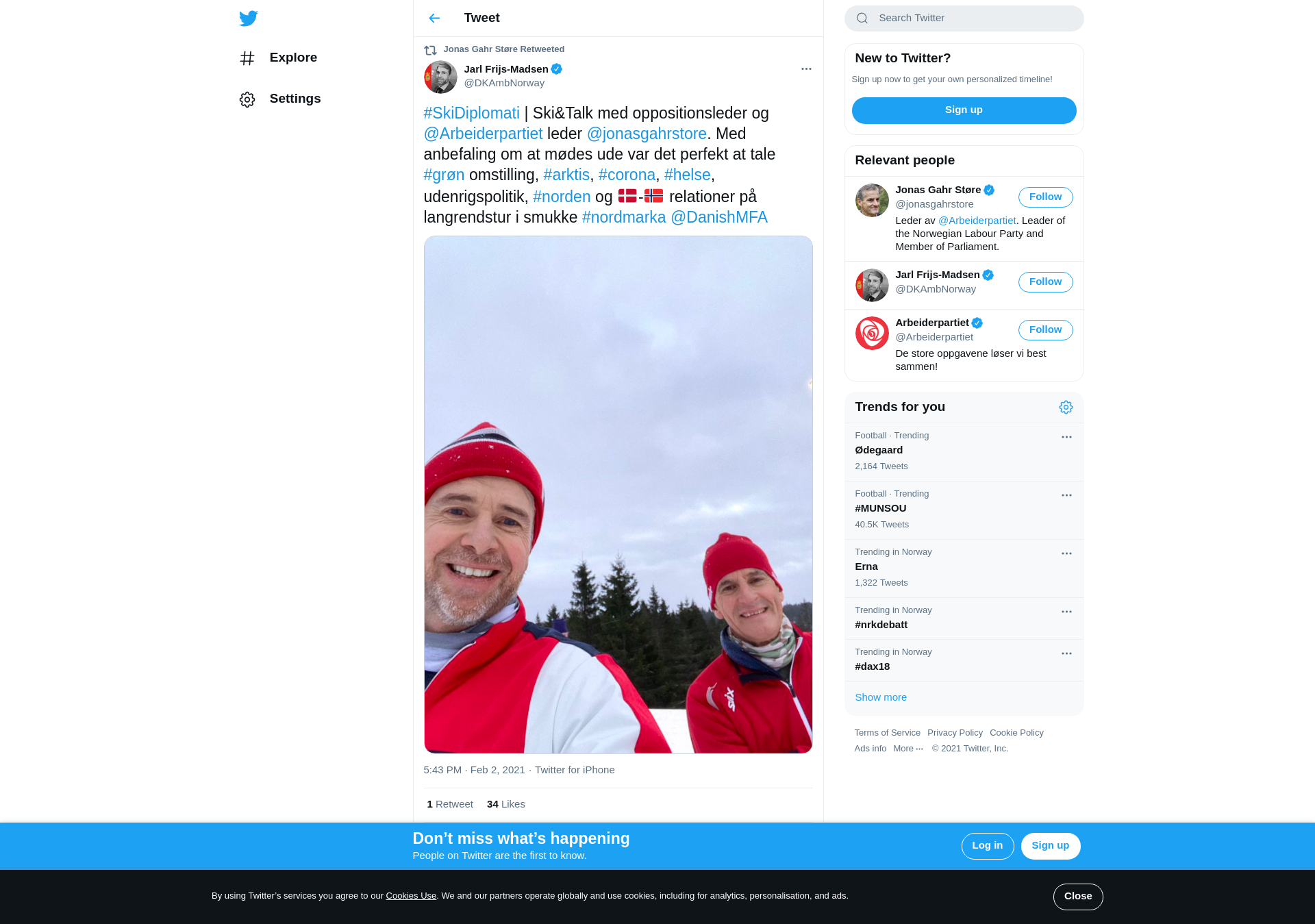RT @DKAmbNorway: #SkiDiplomati | Ski&Talk med oppositionsleder og @Arbeiderpartiet leder @jonasgahrstore. Med anbefaling om at mødes ude var det perfekt at tale #grøn omstilling, #arktis, #corona, #helse, udenrigspolitik, #norden og 🇩🇰-🇳🇴 relationer på langrendstur i smukke #nordmarka @DanishMFA https://t.co/Nz3m4C2adE