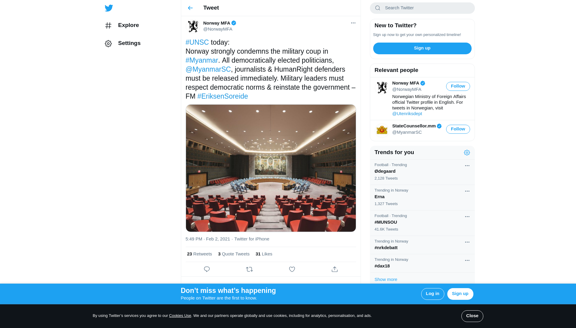 Norway strongly condemns the military coup in #Myanmar. All democratically elected politicians, @MyanmarSC, journalists & HumanRight defenders must be released immediately. Military leaders must respect democratic norms & reinstate the government – FM #EriksenSoreide https://t.co/Kh32AokNL9