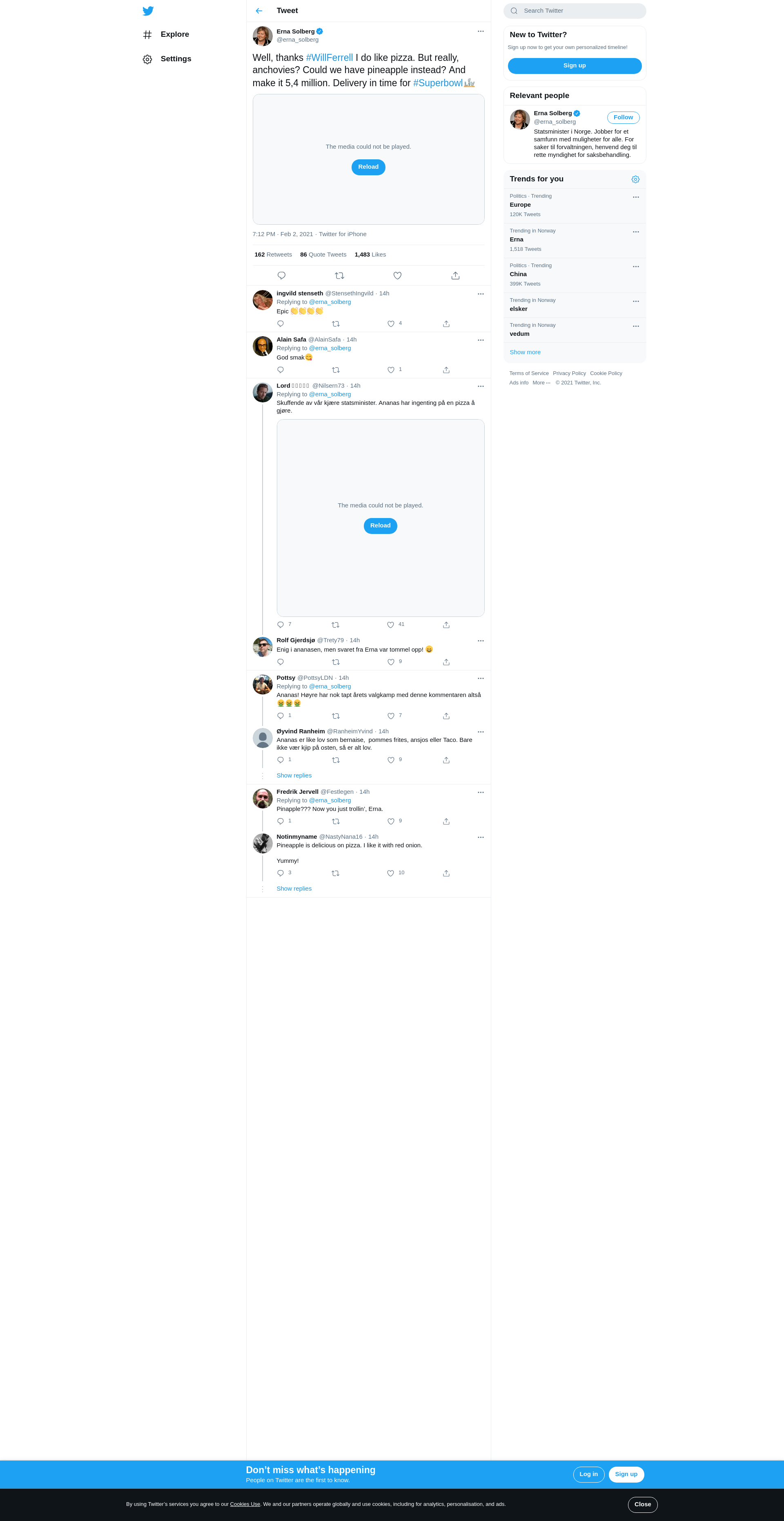Well, thanks #WillFerrell I do like pizza. But really, anchovies? Could we have pineapple instead? And make it 5,4 million. Delivery in time for #Superbowl https://t.co/6FMPcHAcN2